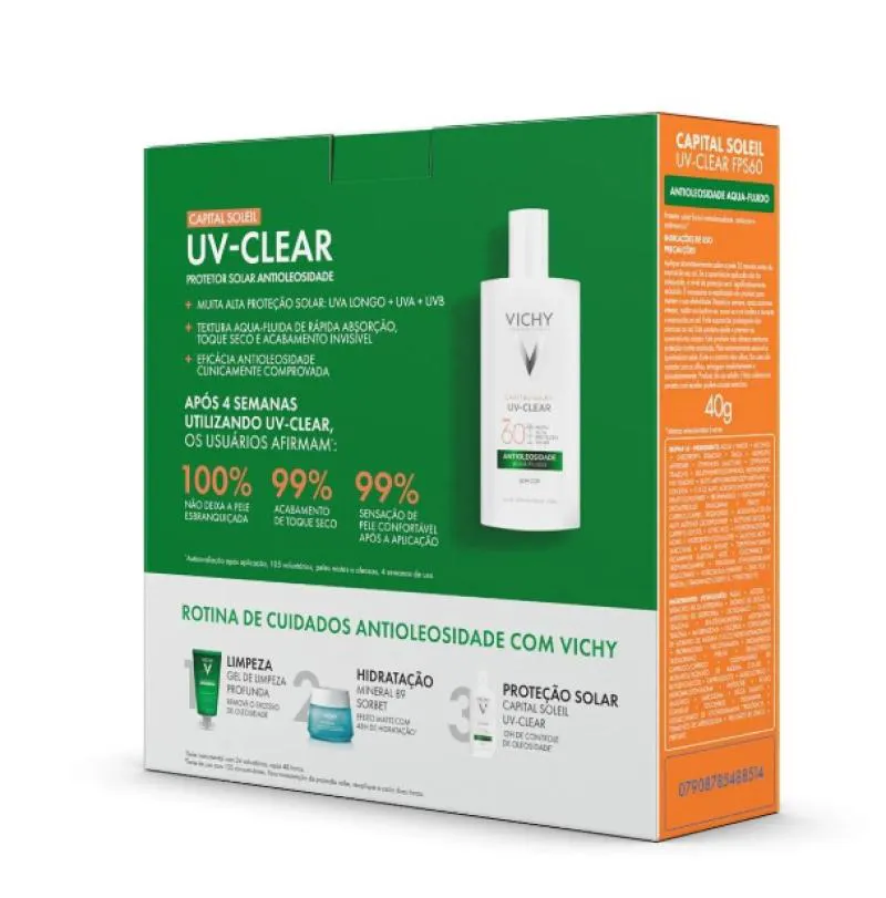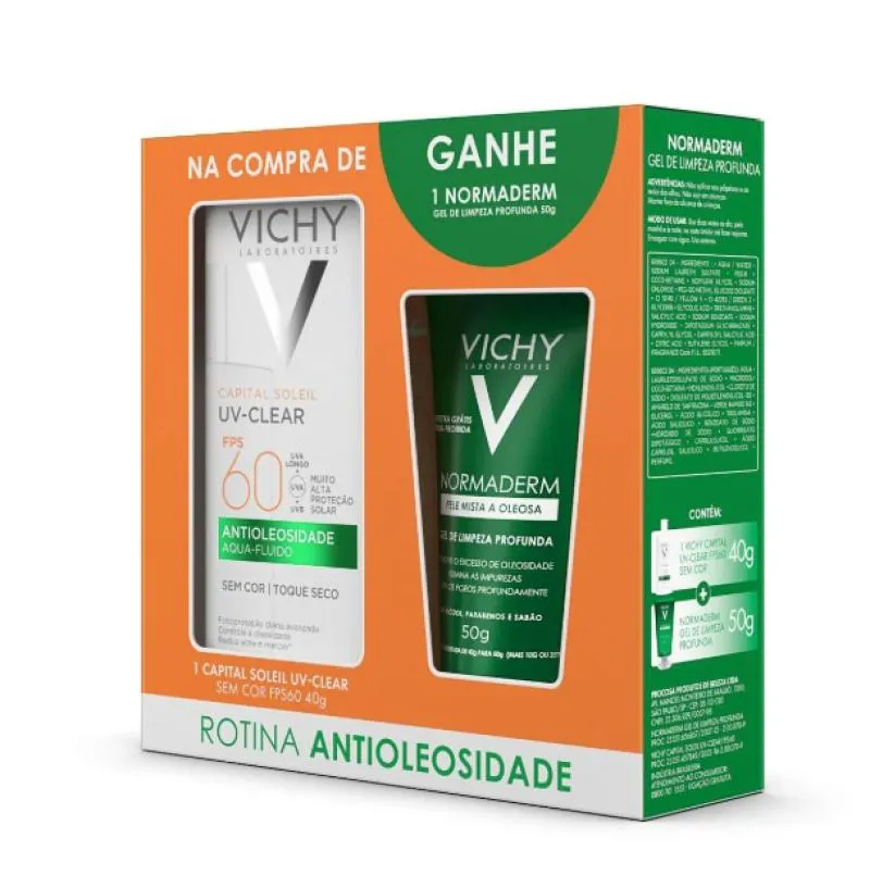 O Kit Vichy combina dois cuidados essenciais para peles oleosas e acneicas: 1 Protetor Solar Facial Capital Soleil UV-Clear Antioleosidade FPS 60 Sem Cor – 40g 1 Gel de Limpeza Facial Vichy Normaderm pele oleosa – 50g Juntos, oferecem limpeza profunda, controle da oleosidade e proteção solar avançada com tratamento antimarcas. Protetor Solar Facial Capital Soleil UV-Clear Antioleosidade FPS 60 Formulado com a tecnologia patenteada Netlock DRY e ativos dermatológicos como Niacinamida e Ácido Salicílico, oferece proteção UVA, UVA longo e UVB com textura aqua-fluida de rápida absorção e acabamento invisível. Controla a oleosidade por até 12 horas, reduzindo em até 40% sua produção em apenas 8 semanas de uso contínuo.