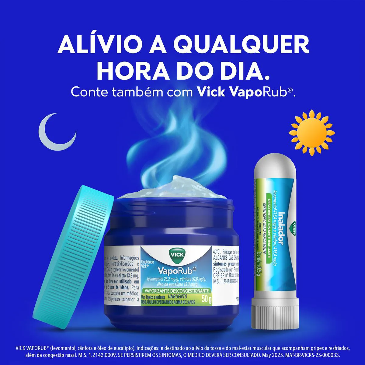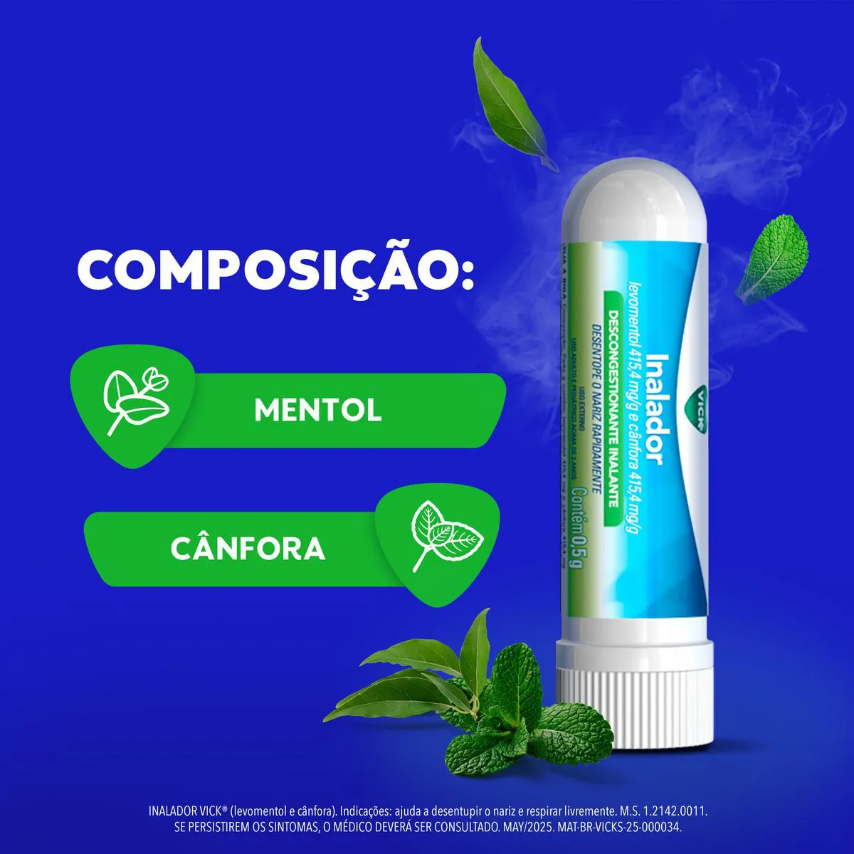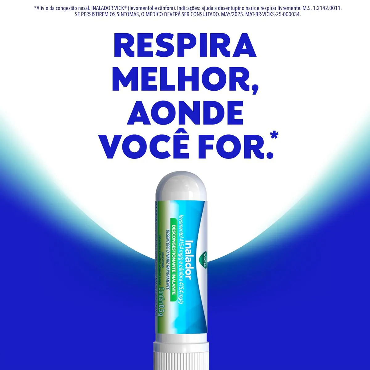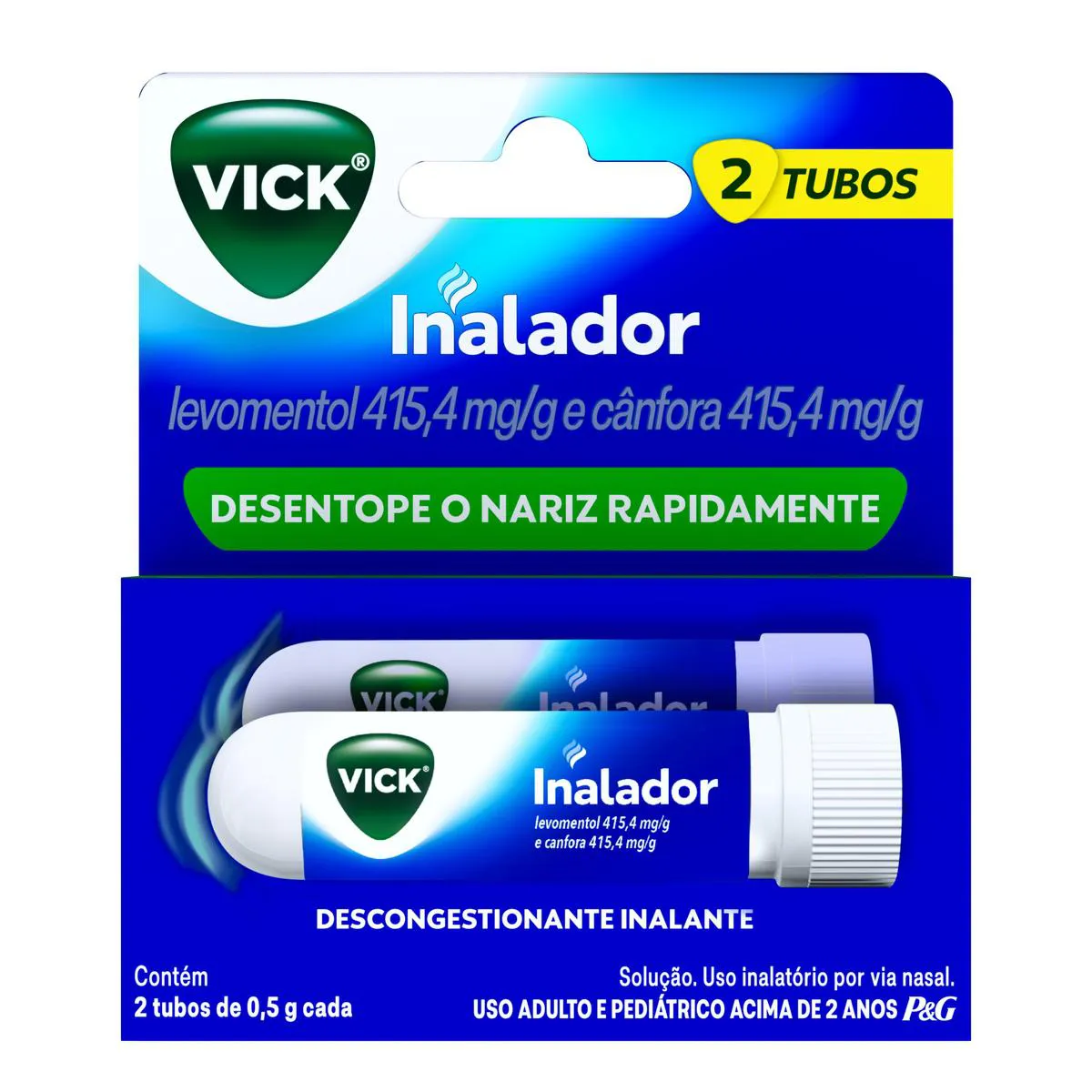 O Vick Inalador Pack c/ 2 é um descongestionante nasal em formato de bastão, indicado para o alívio rápido do nariz entupido causado por gripes e resfriados. Sua ação ocorre por meio da inalação de vapores de mentol e cânfora, que atuam diretamente na mucosa nasal, proporcionando sensação de respiração livre e frescor em poucos segundos.