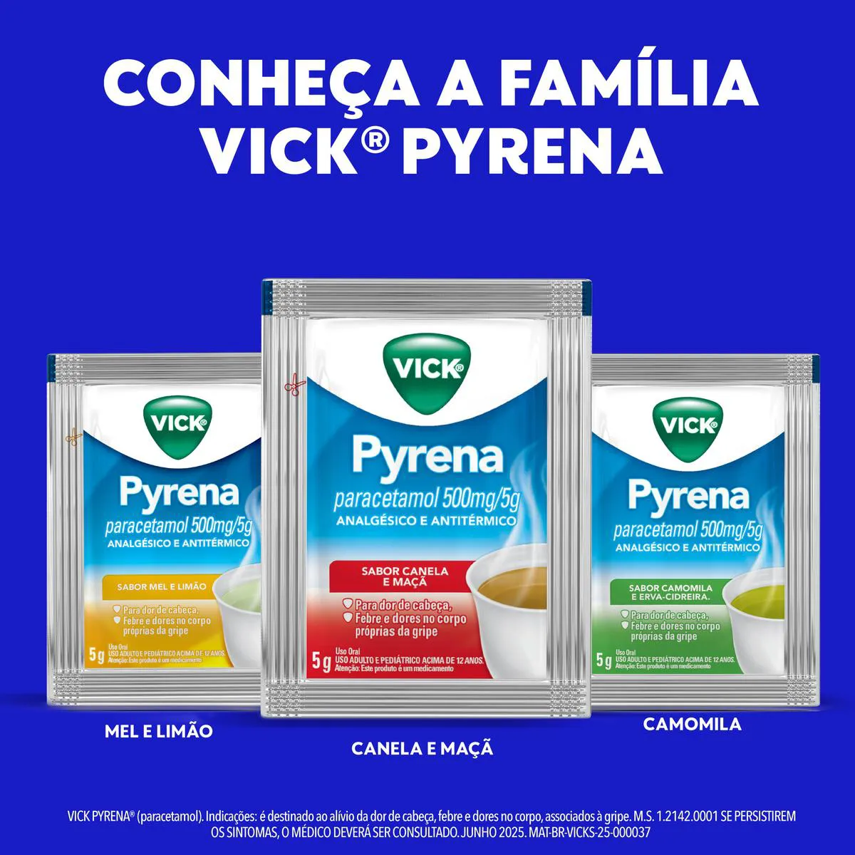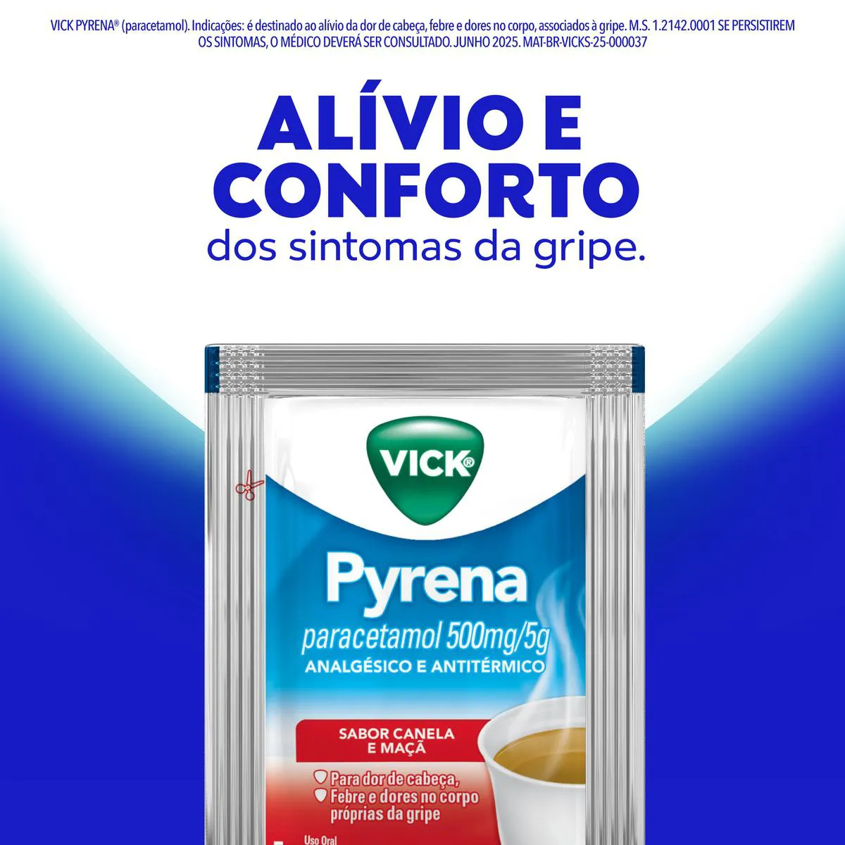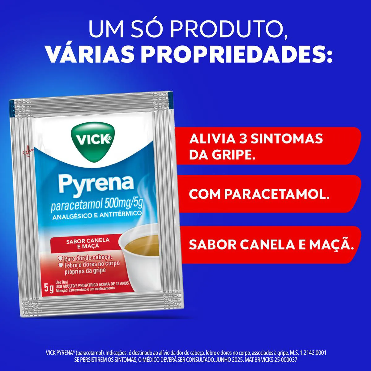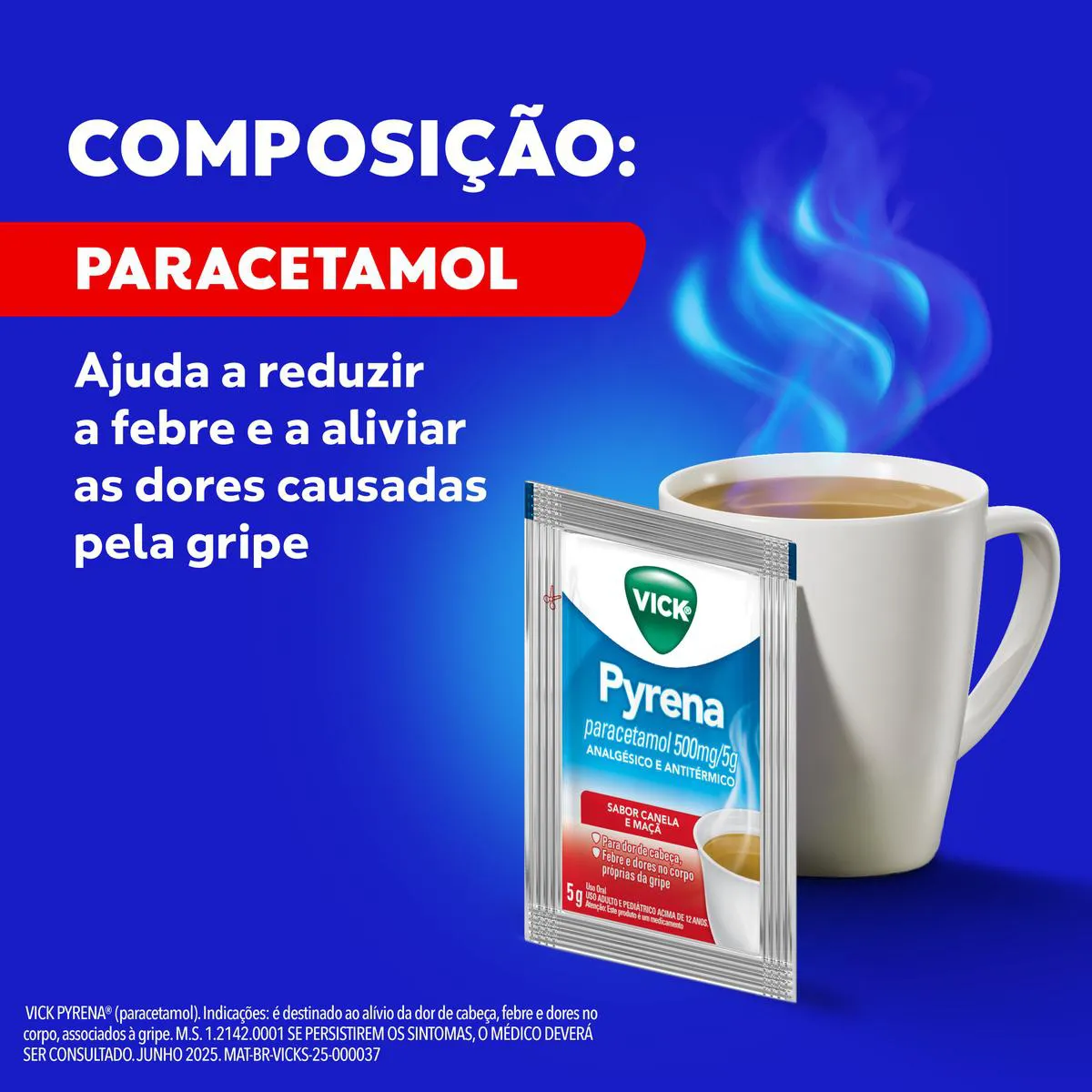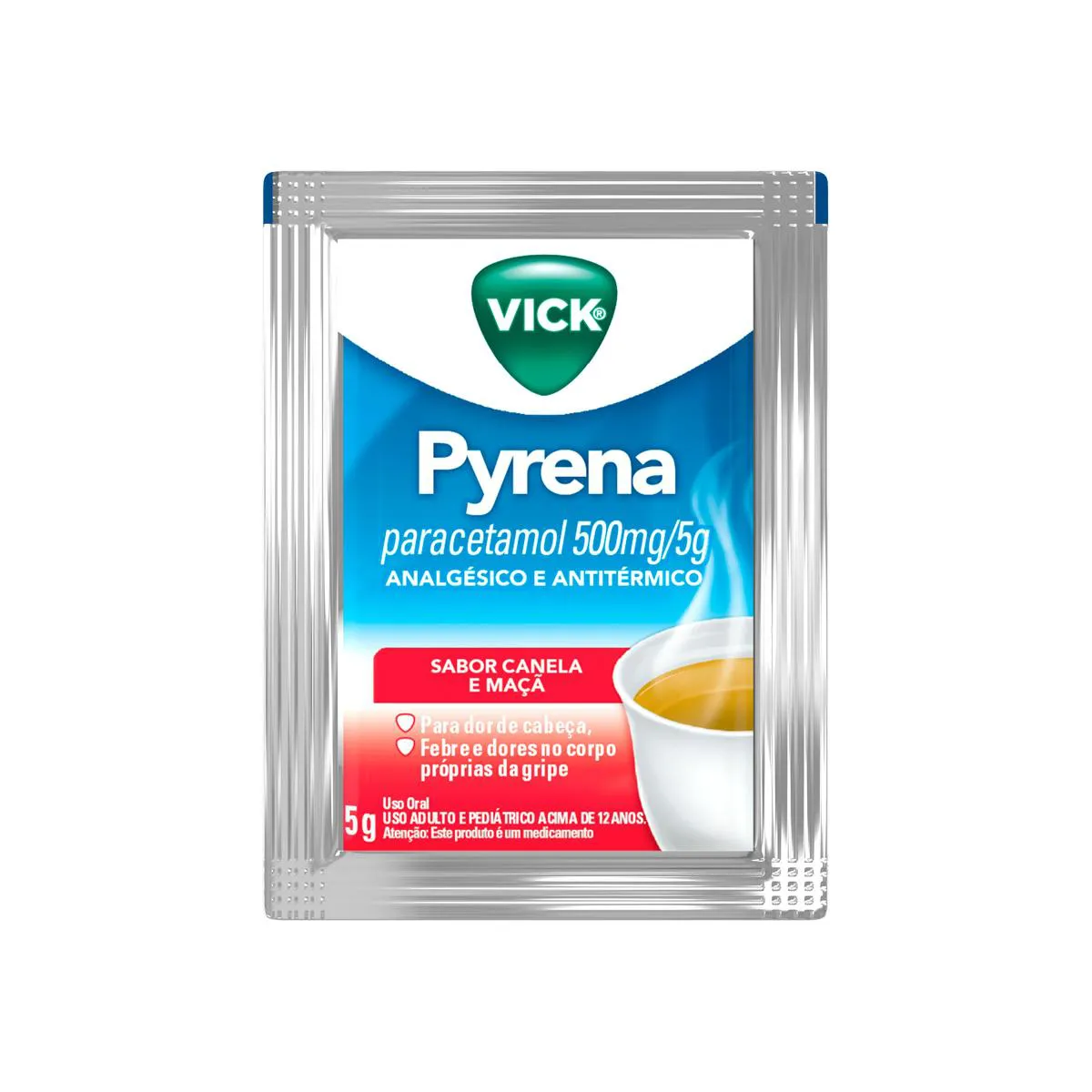 Vick Pyrena é indicado contra dores de cabeça, febre e dores no corpo próprias da gripe. Ele deve ser misturado na água ou no chá quente, não sendo necessária a adição de açúcar.