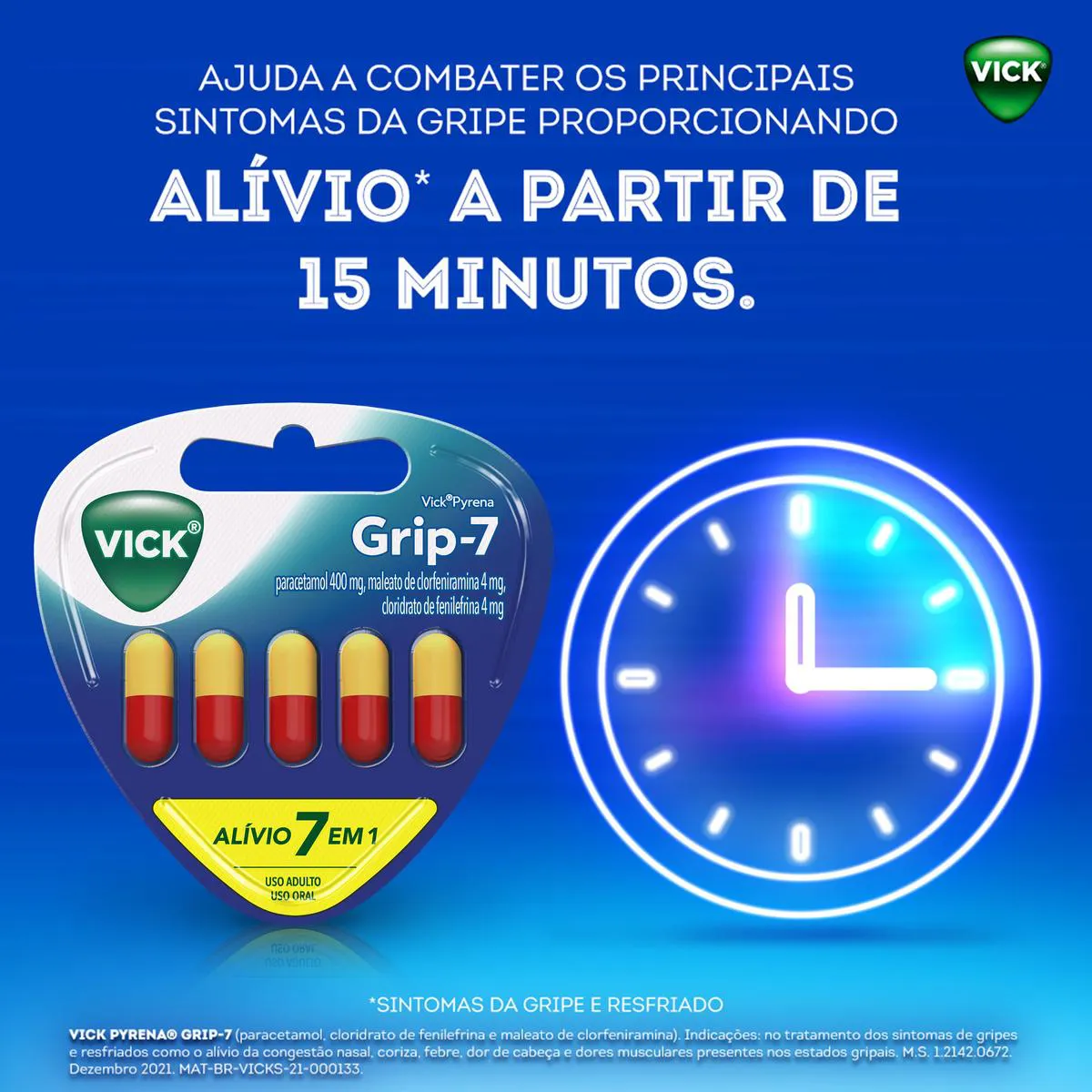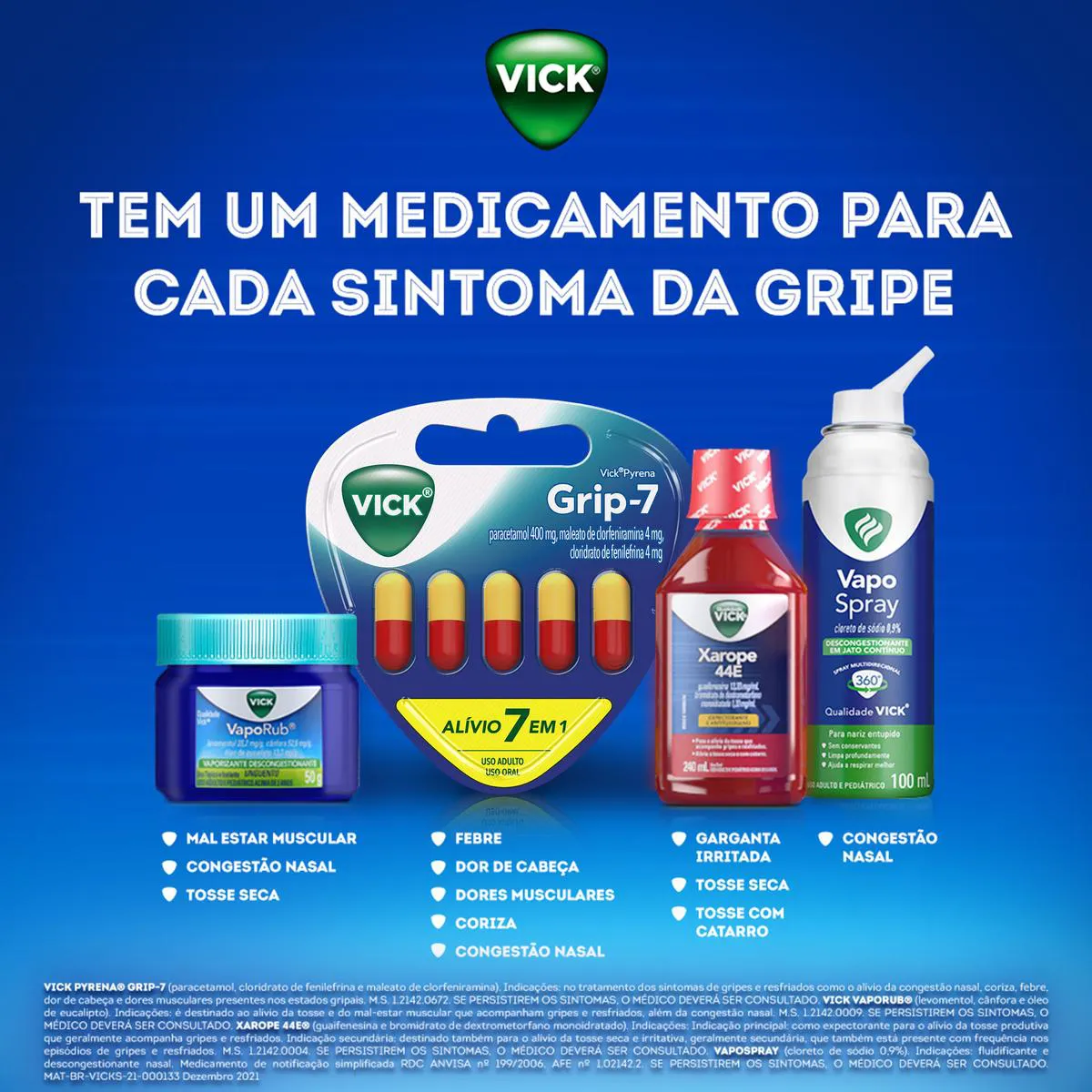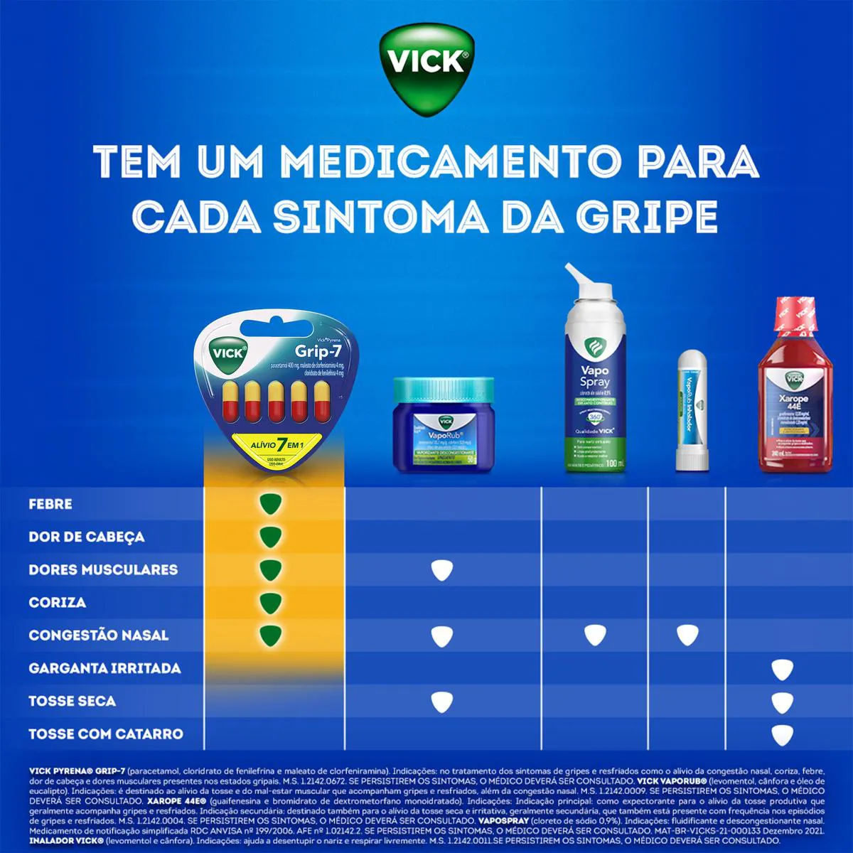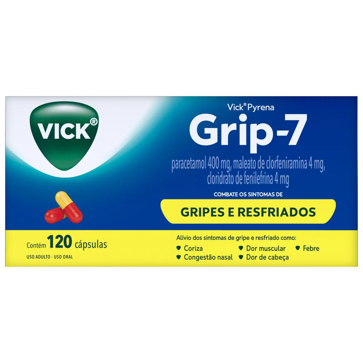 O Vick Pyrena Grip-7 Cápsulas é uma solução completa para o alívio 7 em 1 dos sintomas da gripe e resfriado, em cápsulas. Indicado no tratamento dos sintomas de gripes e resfriados, e destinado ao alívio da congestão nasal, coriza, febre, dor de cabeça e dores musculares presentes nos estados gripais.