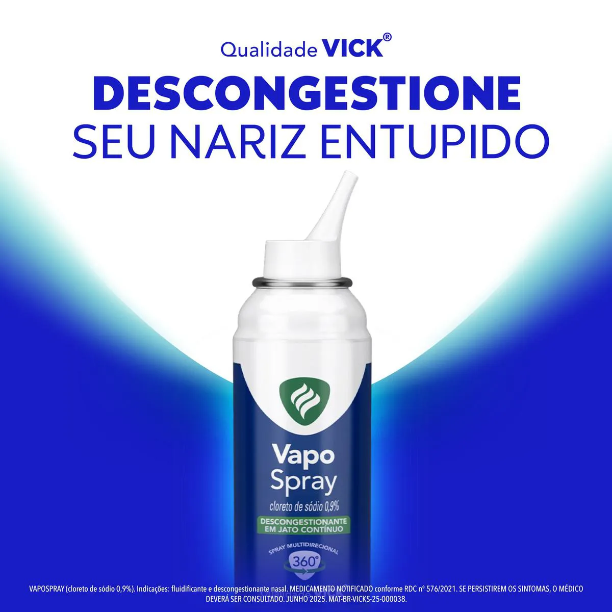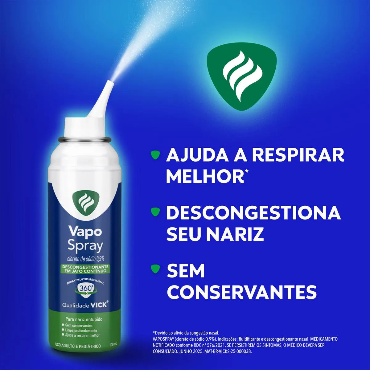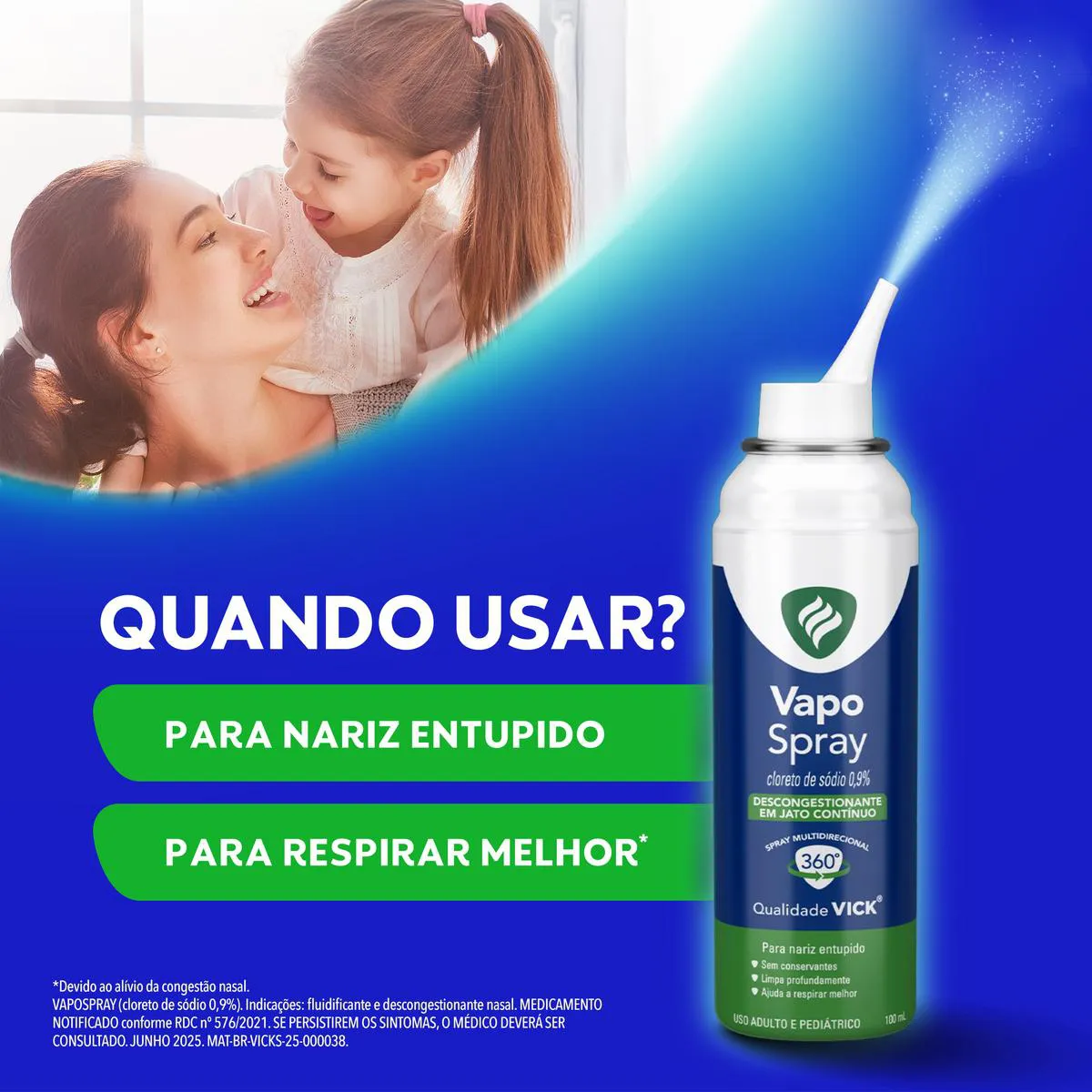 VapoSpray é um spray descongestionante nasal em jato contínuo para nariz entupido que não contém conservantes. Uma solução de cloreto de sódio estéril, sua fórmula limpa profundamente e ajuda a respirar melhor.