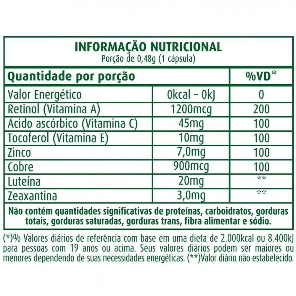 Vision + A (Luteína 20mg - Zeaxantina 3mg (60 caps) Vision + A a Zeaxantina e a Luteína possuem propriedades antioxidantes, portanto, ajudam a nos proteger contra os danos causados pelos radicais livres nas partes do organismo onde elas estão presentes, como por exemplo nos olhos. É um suplemento alimentar de vitaminas e minerais formulados para beneficiar a saúde dos olhos. A Luteína ou lipocromo, é um carotenóide de tonalidade amarelo-limão presente em alguns vegetais, como espinafre, abobrinha, couve-flor, ervilha, brócolis, e em alguns frutos, como laranja, mamão, pêssego e kiwi, além da gema de ovo. É um dos responsáveis pela pigmentação desses mesmos vegetais, sendo utilizado em medicina como antioxidante. A zeaxantina é uma substância responsável pela cor de peixes, aves, flores e alimentos. É encontrada predominantemente nos vegetais amarelos, alaranjados, vermelhos e verdes; tais como nectarina, laranja, mamão, pêssego, brócolis, couve de bruxelas, repolho, couve-flor, ervilha, milho, rúcula, ovo, dentre outros. A zeaxantina é resultante do metabolismo secundário de muitos vegetais pode ser agrupada no grupo dos carotenóides, que incluem também os carotenos. De fato, a zeaxantina é resultante da oxidação de carotenos. A vitamina a é um micronutriente essencial, pertencente ao grupo de vitaminas lipossolúveis. Os compostos que formam a vitamina A (ou vitâmeros) são o retinol, o ácido retinoico, retinal e os carotenoides, sendo este últimos considerados provitaminas. Todos estes compostos possuem em sua estrutura um anel acetônico de beta-ionona por onde se liga uma cadeia de isoprenoides, chamado grupo retinil. Geralmente a vitamina A é consumida na forma de palmitato de retinila. Chegando no intestino estes ésteres sofrem ação dos lipídios (bile e suco pancreático) e então hidrolisados, o retinol é gerado. Ele é então absorvido pelas células do intestino e armazenado. Lá, sofrem outras modificações que permitem que se liguem à quilomícrons e sejam transportados pela corrente sanguínea até o fígado, onde são armazenados. As reservas de vitamina A no fígado sofrem hidrólise, quando é necessário que a vitamina A volte para a corrente sanguínea e chegue até determinada região do corpo.Benefícios:* Possui efeito antioxidante;* Protege dos radicais livre;* Auxilia na saúde dos olhos;* Possui vitaminas e minerais essenciais em sua composição.