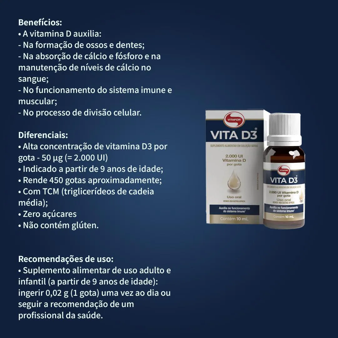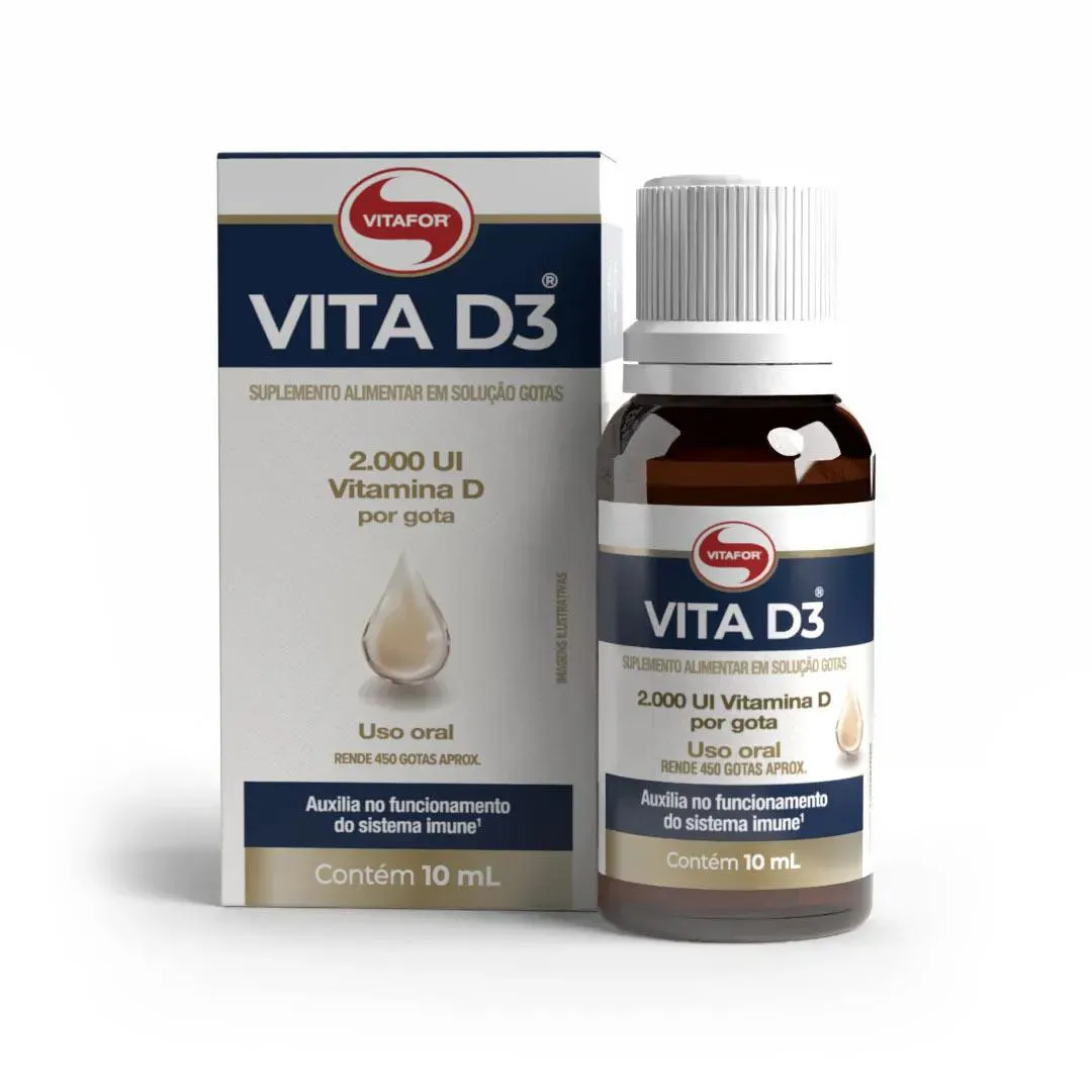 Olá! Tudo bem? Sabemos que, com a rotina corrida e pouca exposição ao sol, nem sempre é fácil manter níveis adequados de vitamina d no organismo. O Vita D3 2.000 UI 10ml Vitafor é uma opção prática para complementar sua rotina, oferecendo vitamina D3 em gotas, facilitando o consumo diário e auxiliando no suporte à imunidade e à saúde óssea. Garanta agora o seu e cuide da sua saúde com praticidade! Aproveite nossas condições e compre com segurança. Especificações Técnicas: - Conteúdo: 10ml
