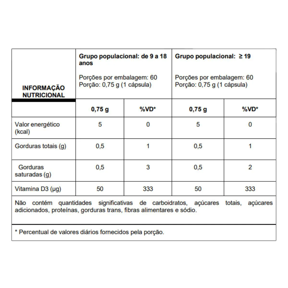 - Com TCM (Triglicerídeos de cadeia média) como veículo. Recomendação de uso: Suplemento alimentar de uso adulto e infantil (a partir de 9 anos de idade): ingerir 1 cápsula ao dia antes das refeições ou seguir a recomendação de um profissional da saúde. Ingredientes: Triglicerídeos de cadeia média e colecalciferol (vitamina D3). Composição da cápsula: gelatina, água purificada e umectante glicerina. NÃO CONTÉM GLÚTEN. Cuidados e conservação: - Mantenha o produto bem fechado e conserve ao abrigo da luz, calor, odores e umidade.