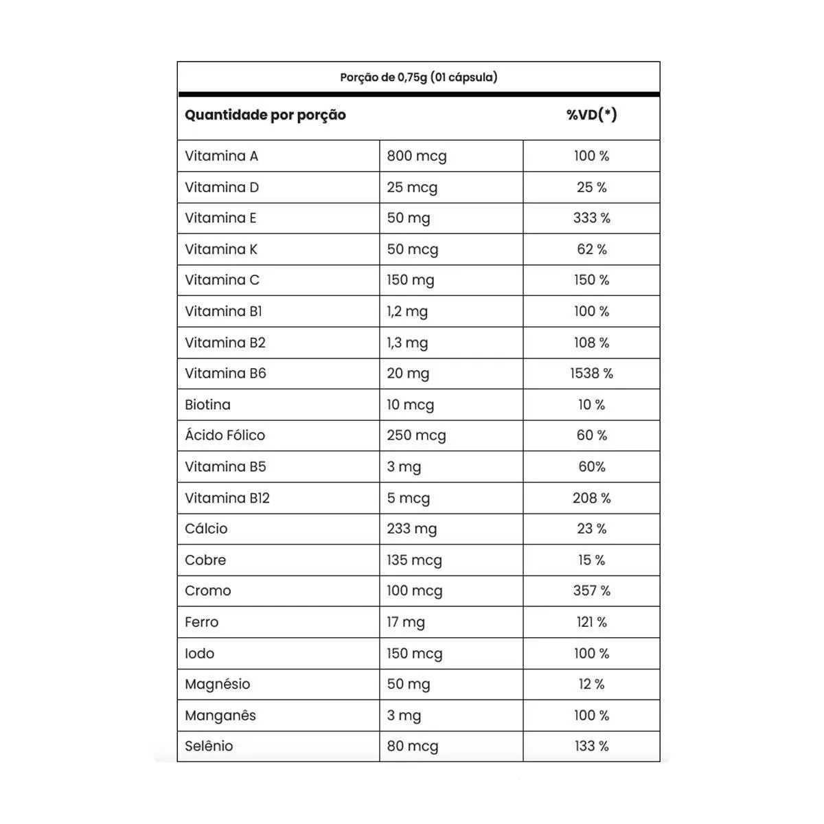 Ácido ascórbico, óxido de magnésio, DL-alfa-tecoferol, cloridrato de piridoxina, fumarato ferroso, óxido de zinco, sulfato de manganês, ácido pantotênico, riboflavina, cloridrato de tiamina, acetado vitamina a, iodeto de sódio, ácido fólico, selenato de sódio, sulfato de cobre, picolinato de cromo, fitonadiona, vitamina D3, D-biotina, cianocobalamina, antiumectante, dióxido de silício e lubrificante estearato de magnésio.