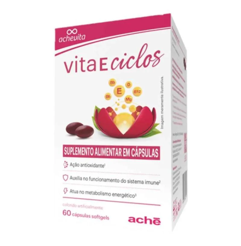O Vita E Ciclos é um suplemento alimentar com fórmula exclusiva que combina vitamina e, Vitaminas do Complexo B, vitamina d e Magnésio, destinado especialmente para mulheres adultas. Os micronutrientes presentes neste suplemento participam de processos importantes relacionados à saúde do organismo. Complementa a ingestão de nutrientes importantes para mulheres adultas. Auxilia no fortalecimento da imunidade. Contribui para o funcionamento muscular adequado. Suporta o metabolismo e a geração de energia do organismo. Combina vitamina E, Vitaminas do Complexo B, Vitamina D e Magnésio em uma única fórmula.