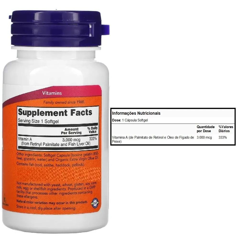 A vitamina a é essencial para a manutenção dos tecidos que revestem as superfícies internas e externos do corpo, incluindo olhos, pele e tratos respiratório, gastrointestinal e urinário. Uso Sugerido Tome uma cápsula gelatinosa por dia, durante uma refeição. Outros Ingredientes Cápsula de gelatina mole (gelatina bovina, glicerina, água) e azeite extra virgem biológico. Contém peixe (bacalhau, escamudo, arinca, pollock). Não fabricado com ingredientes de levedura, trigo, glúten, soja, milho, leite, ovo ou marisco. Produzido em uma instalação de GMP que processa outros ingredientes que contêm esses alérgenos. Advertências Poderá ocorrer alteração natural na coloração do produto. Depois de abrir, armazene em local seco e arejado. Apenas para adultos. Não exceda a dosagem recomendada. Não use caso esteja grávida, amamentando ou pretenda engravidar. Antes de usar este produto, consulte um médico se estiver tomando medicamentos ou se tiver algum problema de saúde. Mantenha fora do alcance de crianças. Produto isento de registro conforme RDC 240/2018.