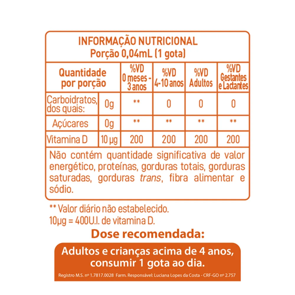 Suplemento alimentar de Vitamina D3 em gotas. Possui 400 UI/por gota de vitamina d que auxilia no funcionamento do sistema imune e muscular. Formação de ossos e dentes absorção de cálcio e fósforo.