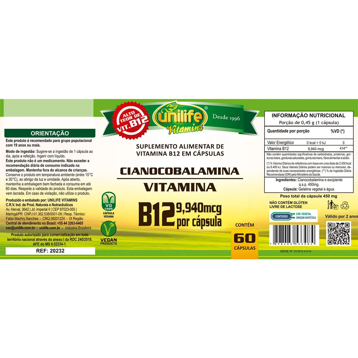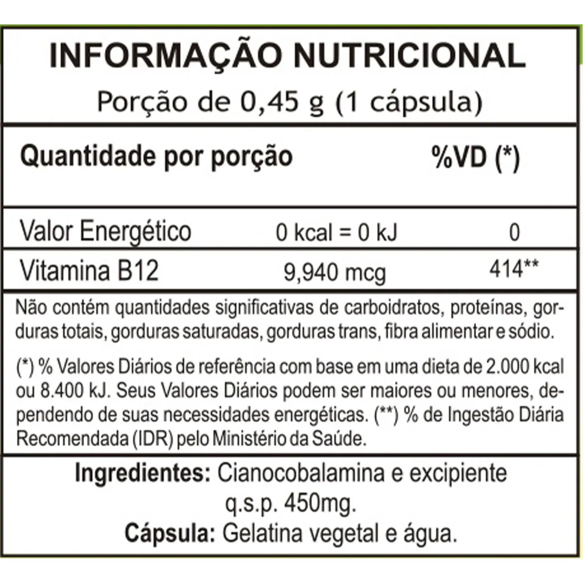 Vitamina B12 (cianocobalamina), excipiente q.s.p. 450mg, gelatina vegetariana e água. NÃO CONTÉM GLÚTEN. LIVRE DE LACTOSE. PRODUTO VEGANO. Cada cápsula contém 2,4 mcg de Vitamina B12.