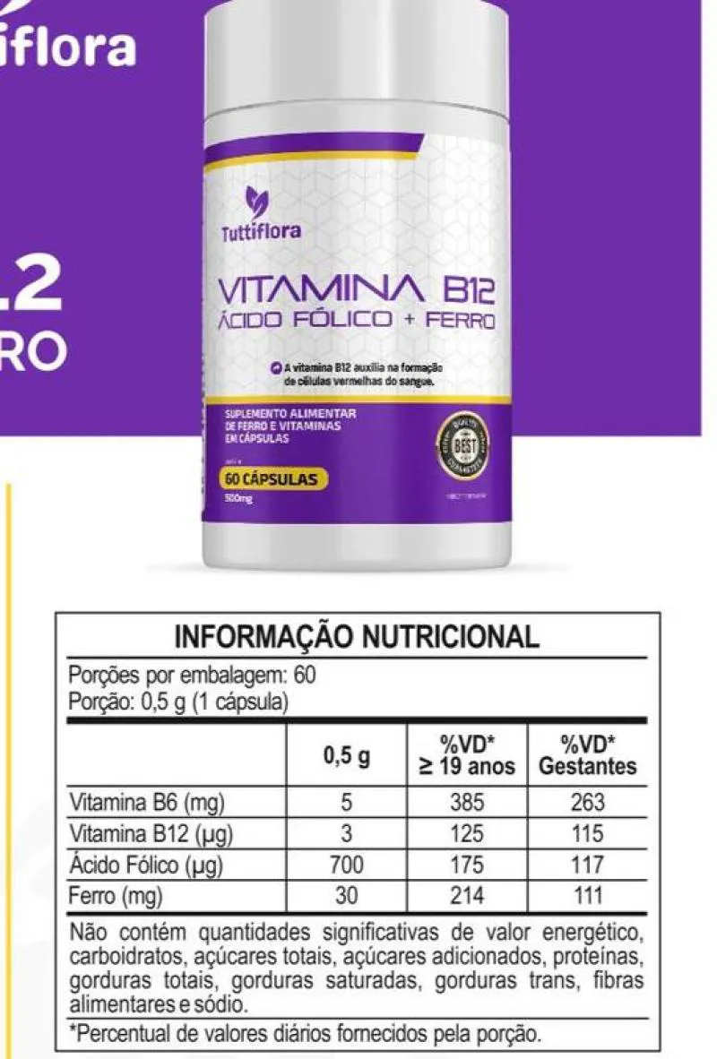 Vitamina B12 + Ferro + Ácido Fólico 60 Cápsulas Tuttiflora