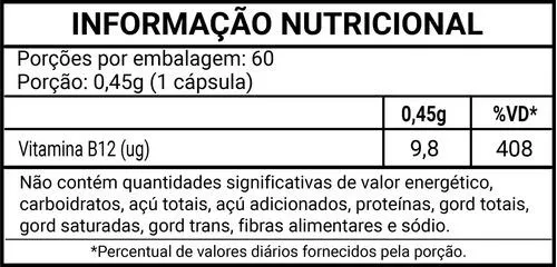 Ingredientes: Vitamina B12 (Metilcobalamina); Antiumectantes: Silicato de Magnésio; Composição da cápsula: HPMC (hidroxipropilmetilcelulose) e água.