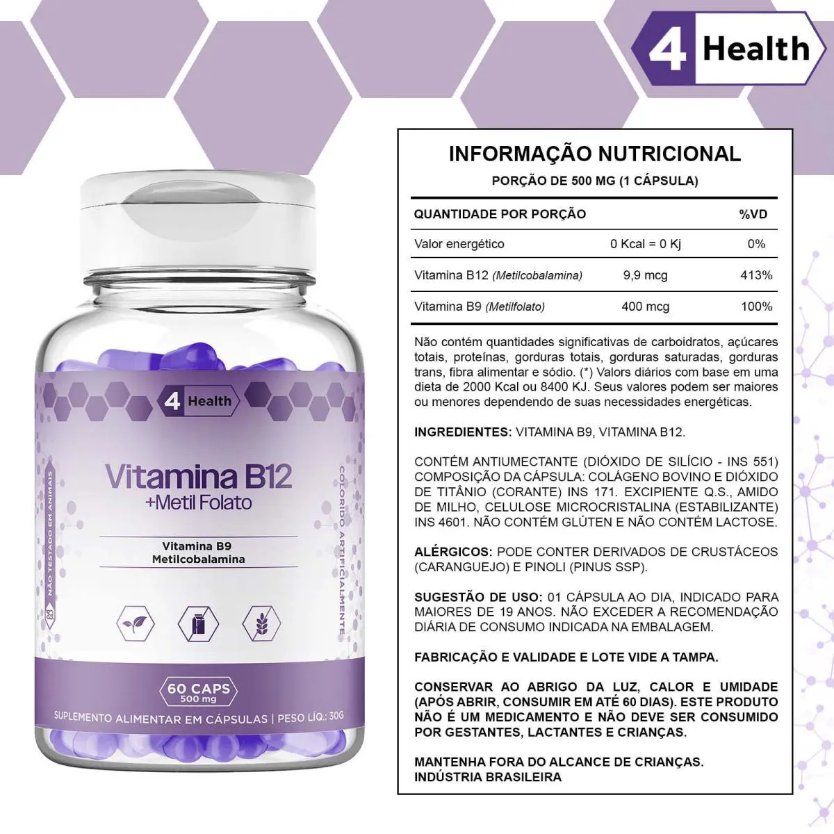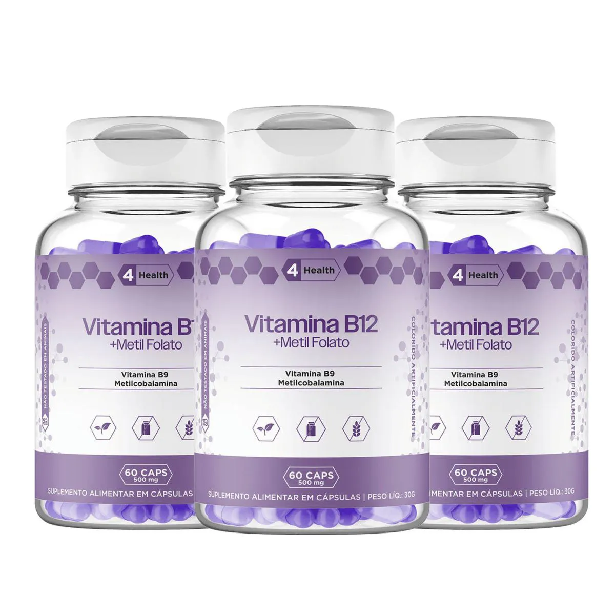 Vitamina B12 + Metilfolato 60 Capsulas - 4 Health - 3 Potes