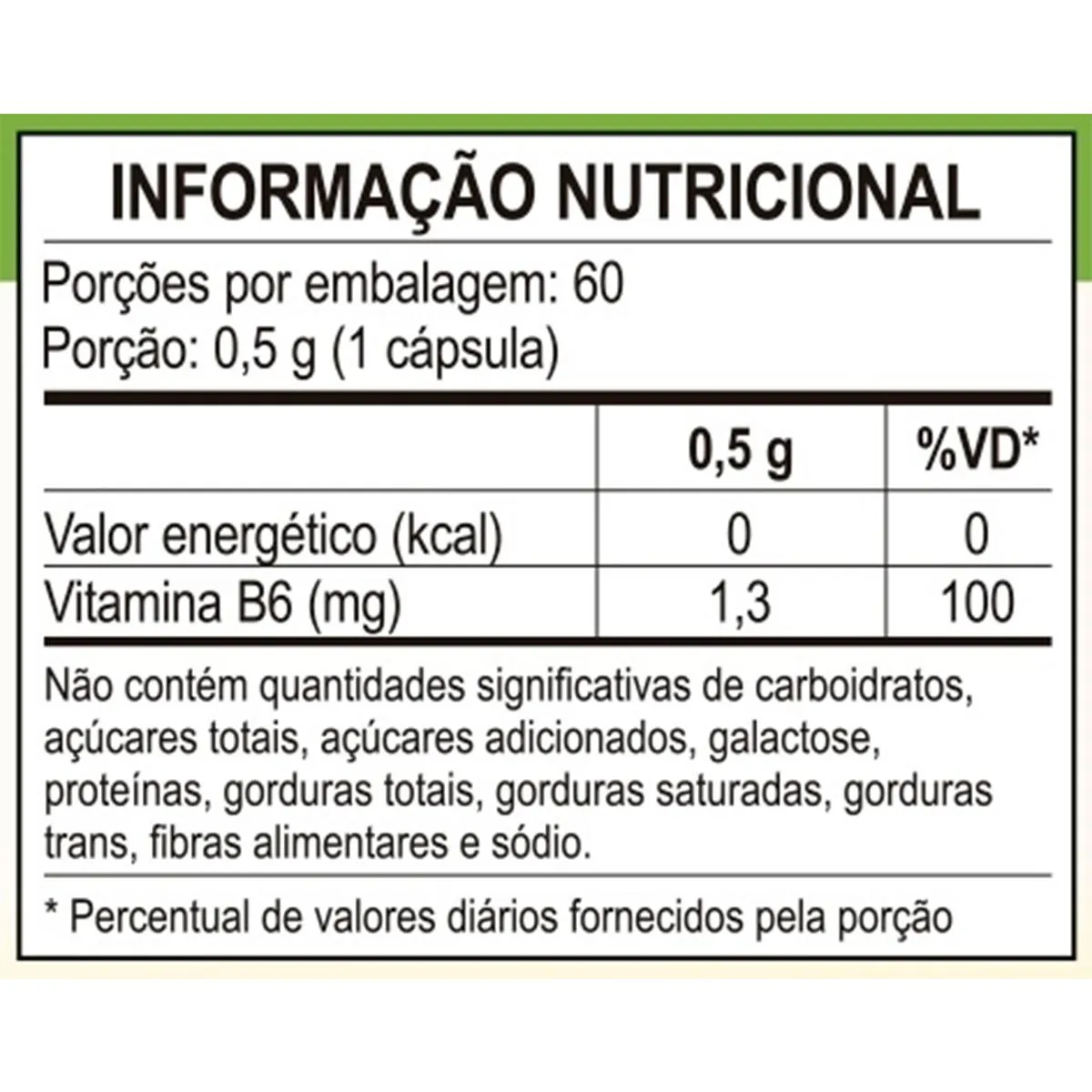 Produto vegano Modo de uso: Sugere-se a ingestão de 1 cápsula ao dia, preferencialmente após a refeição, acompanhada de líquido. Este suplemento é uma alternativa prática para quem busca complementar a alimentação com vitamina B6.