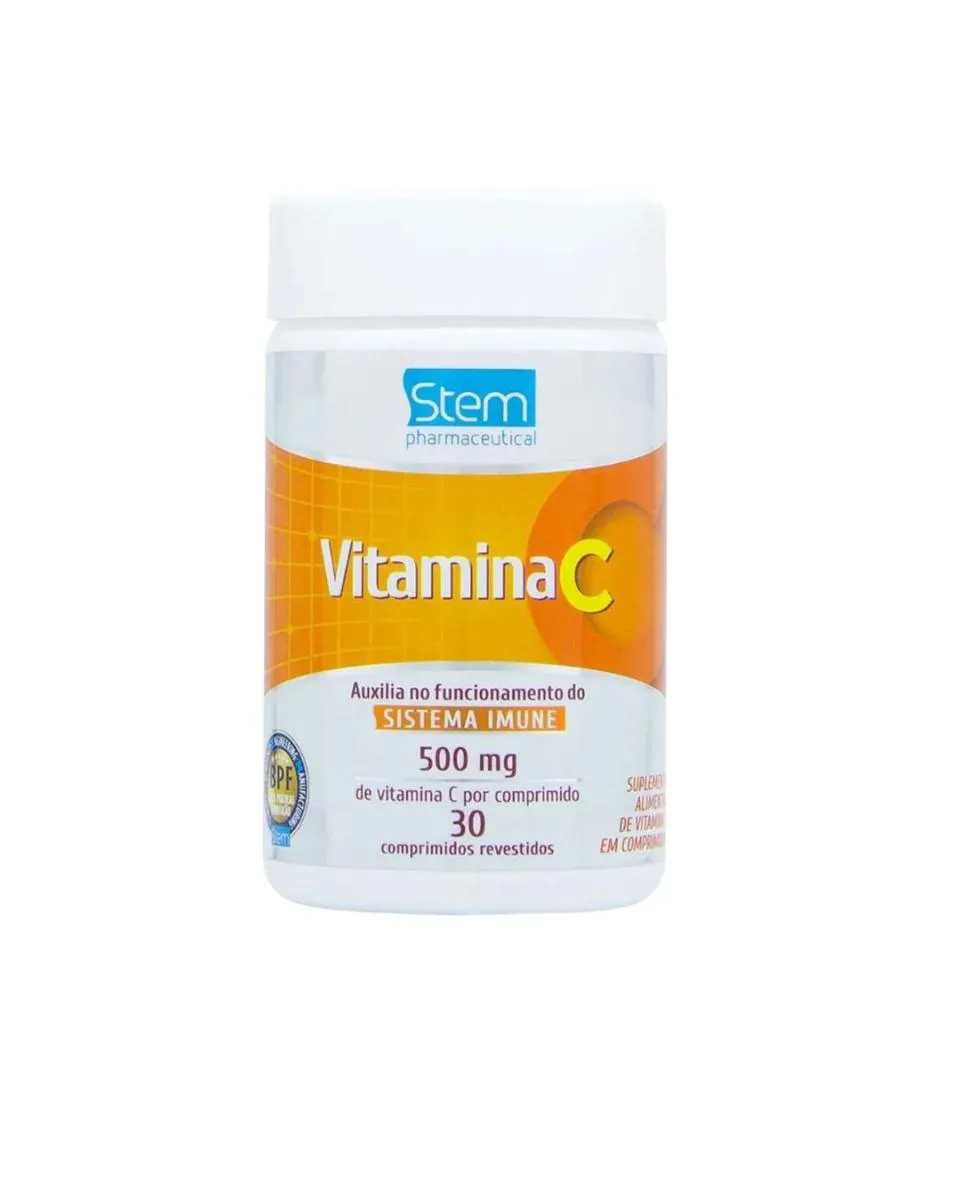 Suplemento alimentar de vitamina c em comprimidos da Stem Pharmaceutical.Cada comprimido contém 500mg de vitamina C.Sugestão de Uso: 1 comprimido ao dia, durante uma das refeições.Ingredientes: Vitamina C, agentes de massa celulose microcristalina e sorbitol, antiumectante dióxido de silício, glaceantes hidroxipropilmetilcelulose e etilcelulose, corantes: dióxido de titânio, amarelo de quinoleína, vermelho allura Ac e espesante polietilenoglicol. NÃO CONTÉM GLÚTEN.Garanta já sua rotina de saúde com a Vitamina C 500mg Stem, reconhecida pela eficácia e segurança comprovadas. Sua imunidade merece esse cuidado diário.