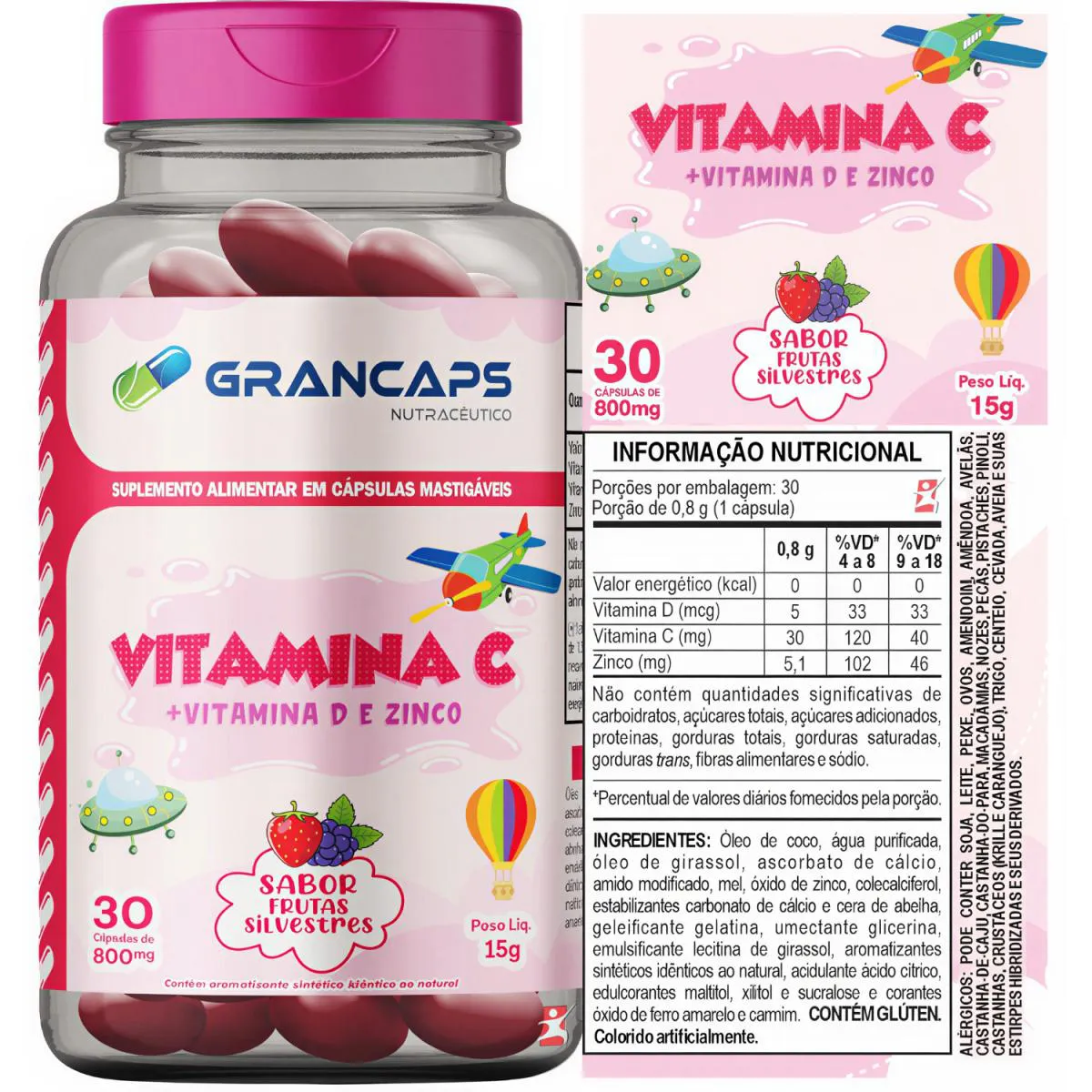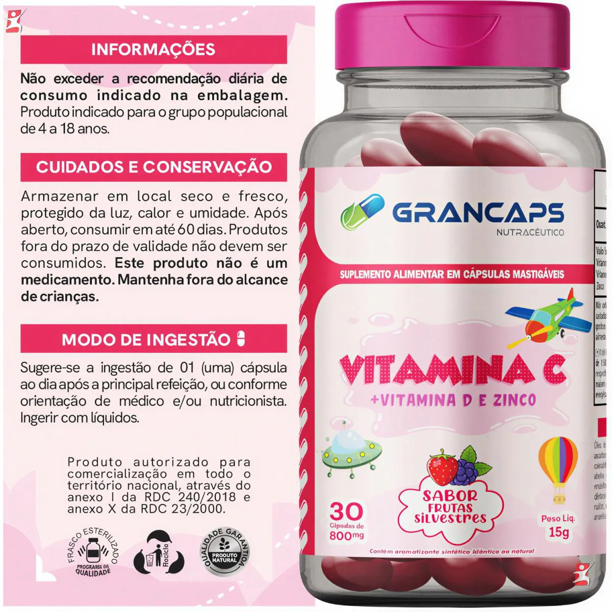 vitamina c + D3 + ZINCO KIDS - TRIPLA PROTEÇÃO 30 CÁPSULAS MASTIGÁVEIS FRUTAS SILVESTRES - GRANCAPS DESCRIÇÃO Esse é um suplemento infantil em cápsulas com vitamina C, vitamina D3 e zinco formulado para crianças. A combinação desses nutrientes ajuda a complementar a ingestão diária de vitaminas e minerais essenciais, oferecendo suporte importante ao organismo enquanto as crianças crescem. Ele vem com sabor de frutas silvestres para tornar o consumo mais agradável e fácil para os pequenos. BENEFÍCIOS - Cada frasco rende 30 doses/porções; - Apenas 01 cápsula ao dia; - Cápsulas mastigáveis com sabor frutas silvestres; - Reforça o sistema imunológico - A vitamina C, a D3 e o zinco juntos fortalecem as defesas naturais do corpo e ajudam a reduzir o risco de infecções. - Apoia a formação de ossos e dentes saudáveis - A vitamina D3 é essencial para a absorção de cálcio e fósforo, importantes para ossos e dentes fortes. - Ação antioxidante - A vitamina C tem ação antioxidante, ajudando a proteger as células contra danos causados pelos radicais livres. - Contribui para o crescimento e desenvolvimento infantil - Esses nutrientes são importantes para o desenvolvimento geral das crianças, incluindo metabolismo celular e crescimento físico. - Ajuda na manutenção da saúde da pele, cabelo e unhas - O zinco também contribui para manter a saúde da pele e dos tecidos, além de participar da síntese de proteínas. SUGESTÃO DE USO Sugere-se a ingestão de 01 (uma) cápsula ao dia, após a principal refeição, ou conforme orientação de médico e/ou nutricionista. TABELA NUTRICIONAL - COMPOSIÇÃO - RECOMENDAÇÕES & CUIDADOS Anexo nas imagens do anúncio. REGISTRO ANVISA Produto autorizado para comercialização em todo o território nacional, através do ANEXO I da RDC 240/2018 e anexo X da RDC 23/2000.