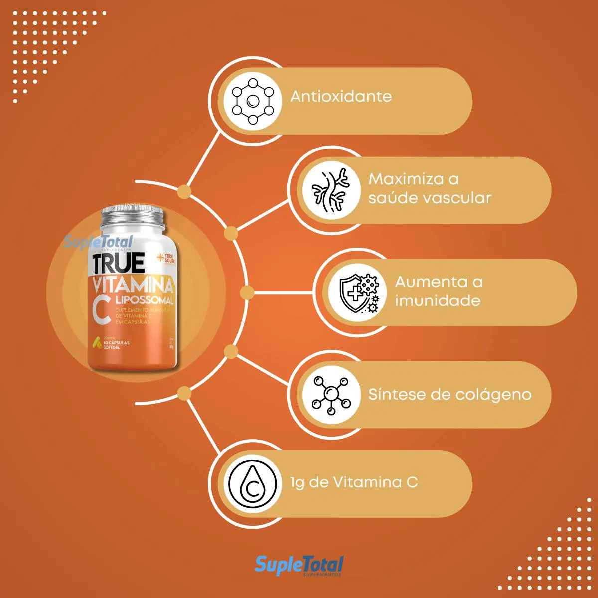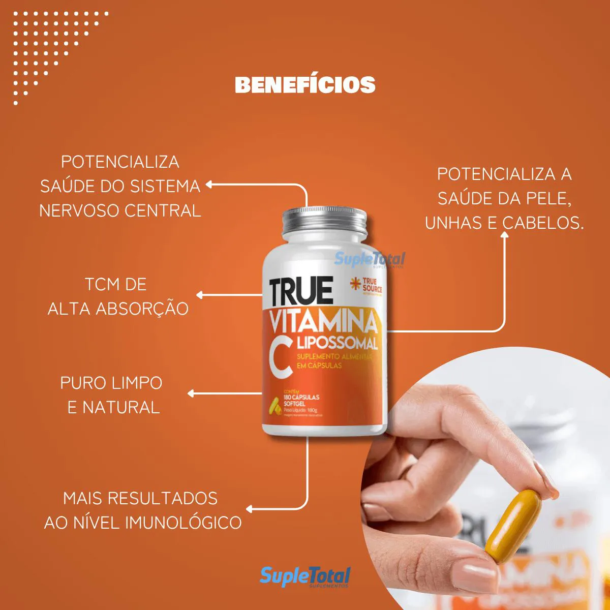 True vitamina c 180 Cápsulas A vitamina C é um micronutriente essencial ao ser humano, por isso a suplementação se faz necessária para a manutenção da saúde. Uma alimentação equilibrada, baseada em frutas e vegetais, é fundamental para o adequado funcionamento do corpo, porém hoje em dia nossas necessidades nutricionais estão mais altas, nossos solos cada vez mais pobres e nossos alimentos com cargas cada vez menores de vitaminas e minerais. Por isso a suplementação com micronutrientes não só se faz necessária, como essencial. A vitamina C é uma vitamina muito sensível, pois sua degradação já começa a acontecer na colheita do alimento. Ela é uma vitamina essencial para a produção endógena de colágeno, para manutenção da imunidade, age como um potente antioxidante, e deve fazer parte da vida de pessoas que buscam gerenciar o processo de envelhecimento. A Vitamina C lipossomal é uma vitamina C encapsulada em lipossomas, que são pequenas partículas de gordura (usamos o TCM), que a protege durante o processo absortivo potencializando a sua absorção, fazendo a vitamina C ser entregue diretamente aos tecidos do corpo, aumentando a sua ação e eficácia. A vitamina C lipossomal trará ainda mais resultados a nível imunológico, cardiovascular, sistema nervoso central, pele, unhas e cabelos.