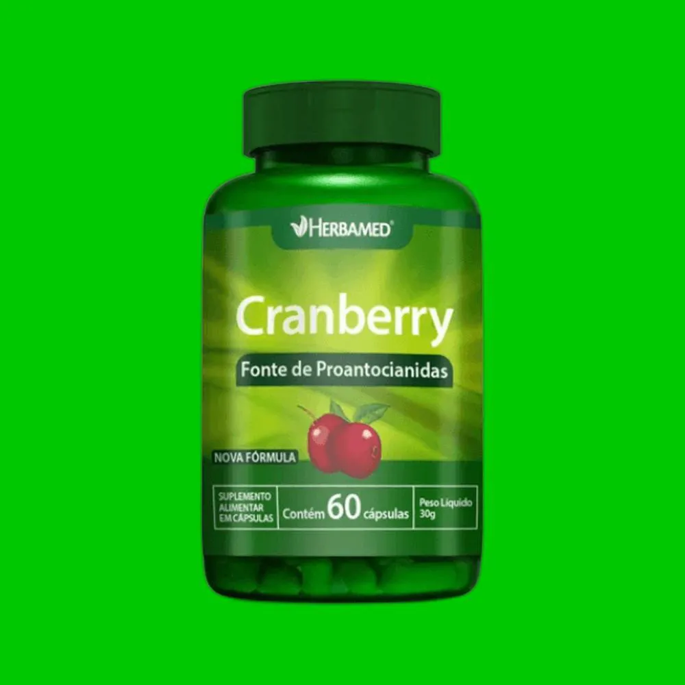 Suplemento alimentar em cápsulas que combina cranberry em pó, rico em antioxidantes como proantocianidinas, com vitamina c e minerais, voltado ao suporte da saúde do trato urinário e proteção às células.