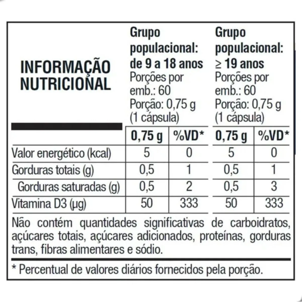 - Suplementação de Vitamina D3 em dose padronizada de 2.000UI para apoio nutricional.