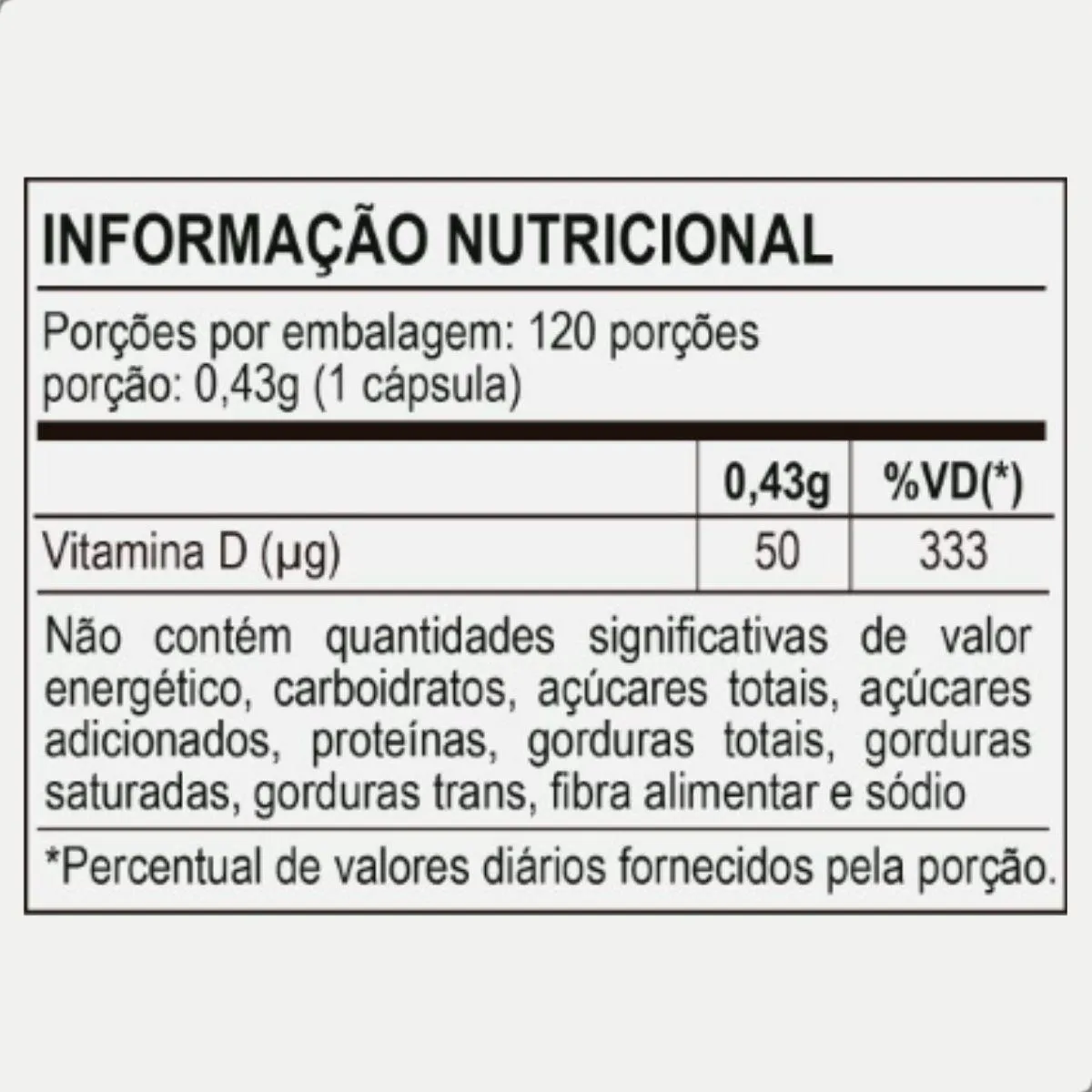 É um suplemento nutricional composto por cápsulas de vitamina D3 (colecalciferol) diluído em óleo de soja ou girassol, acondicionado em frasco com 120 unidades. Cada cápsula contém 2.000 UI de vitamina D3, sendo produzida em cápsula de gelatina, sem glúten, sem lactose e livre de componentes de origem animal. Serve para complementar a ingestão diária de vitamina d, auxiliando pessoas que desejam manter níveis adequados deste nutriente, com a praticidade de tomar apenas uma cápsula por dia.