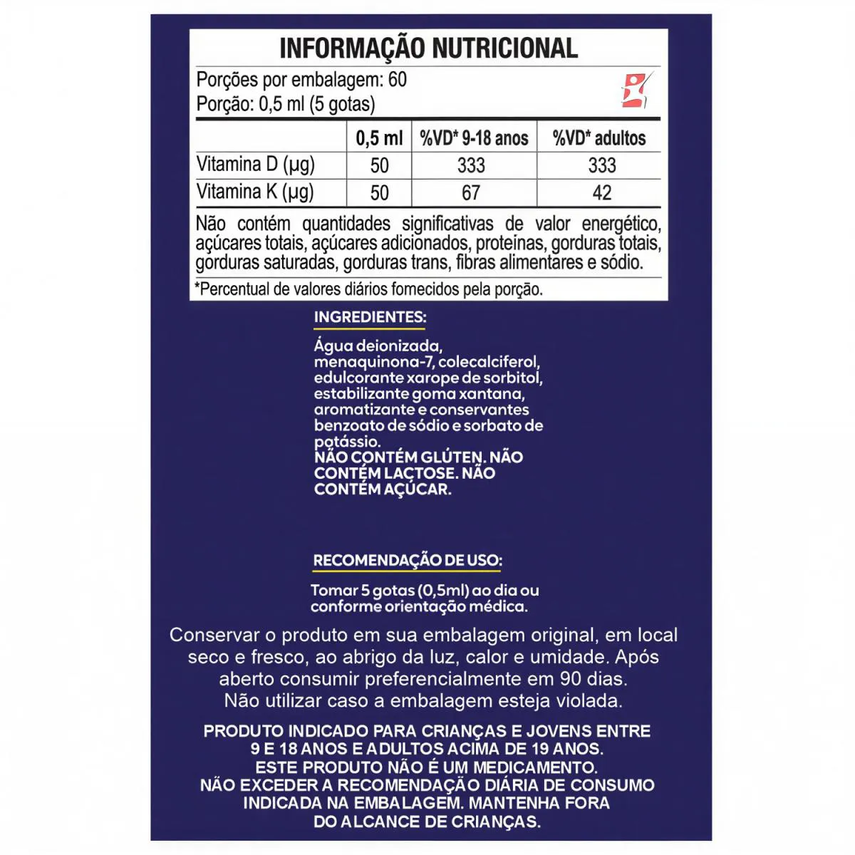 DESCRIÇÃO Versão em gotas da Vitamina K2 + Vitamina D3 com sabor frutas vermelhas. A Vitamina K auxilia na coagulação do sangue e na manutenção dos ossos. A vitamina d auxilia na formação de ossos e dentes e na absorção de cálcio e fósforo. BENEFÍCIOS
