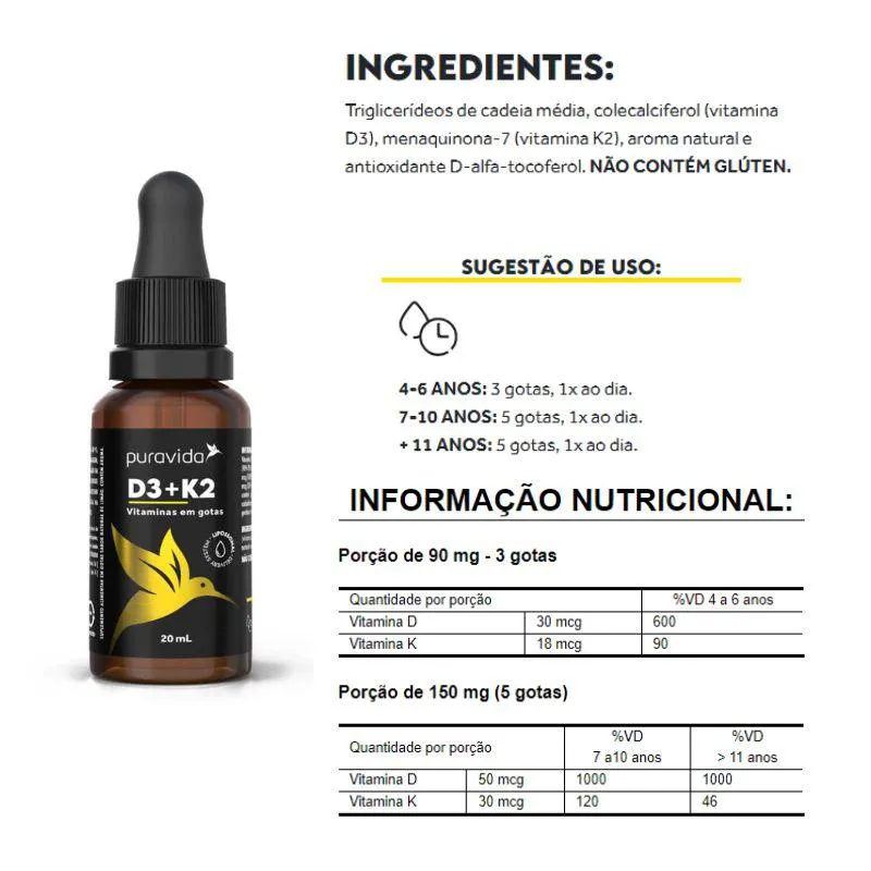 Em uma dose (5 gotas), você encontra2000 UIs de vitamina D, e 30 mcg de vitamina K2 (menaquinona).