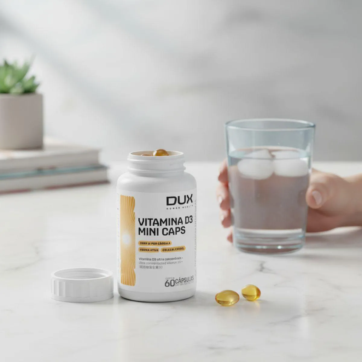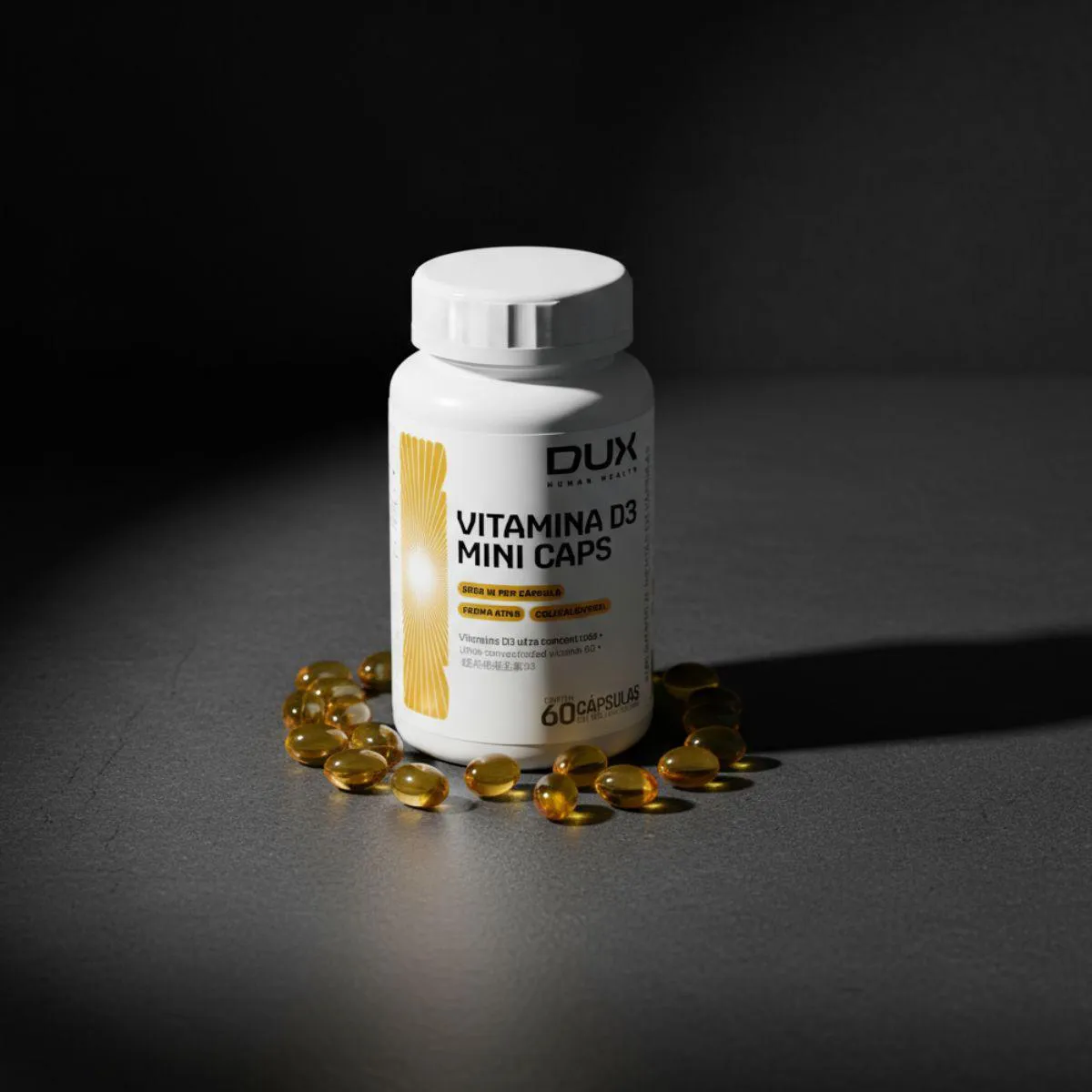 A versão com 60 cápsulas de Vitamina D3 Mini Caps 2000 UI da Dux é indicada para quem deseja um suplemento de vitamina D3 de fácil ingestão. Cada cápsula contém 2000 UI de colecalciferol e utiliza óleo de oliva como veículo. O produto é livre de glúten e lactose, oferecendo praticidade para complementar a dieta.