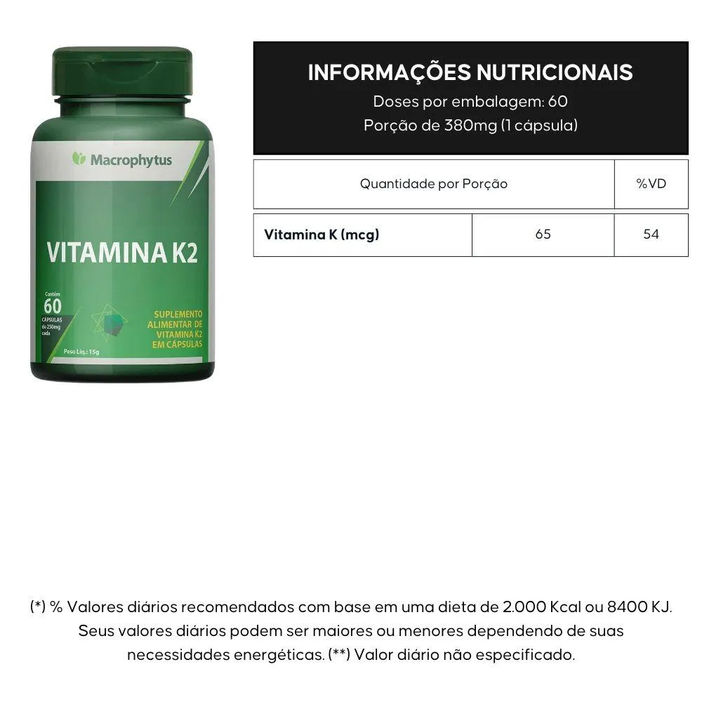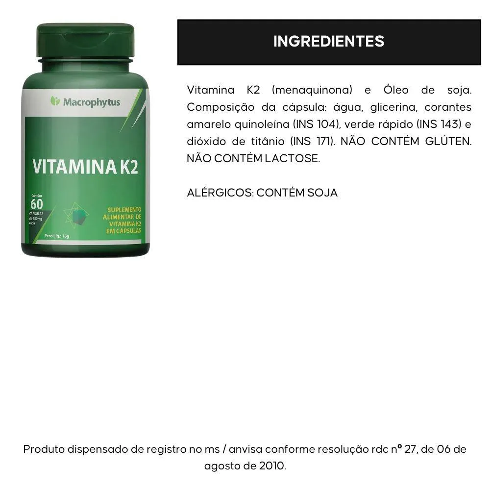 Vitamina K2 (menaquinona) e Óleo de soja. Composição da cápsula: água, glicerina, corantes amarelo quinoleína (INS 104), verde rápido (INS 143) e dióxido de titânio (INS 171). NÃO CONTÉM GLÚTEN. NÃO CONTÉM LACTOSE. ALÉRGICOS: CONTÉM SOJA