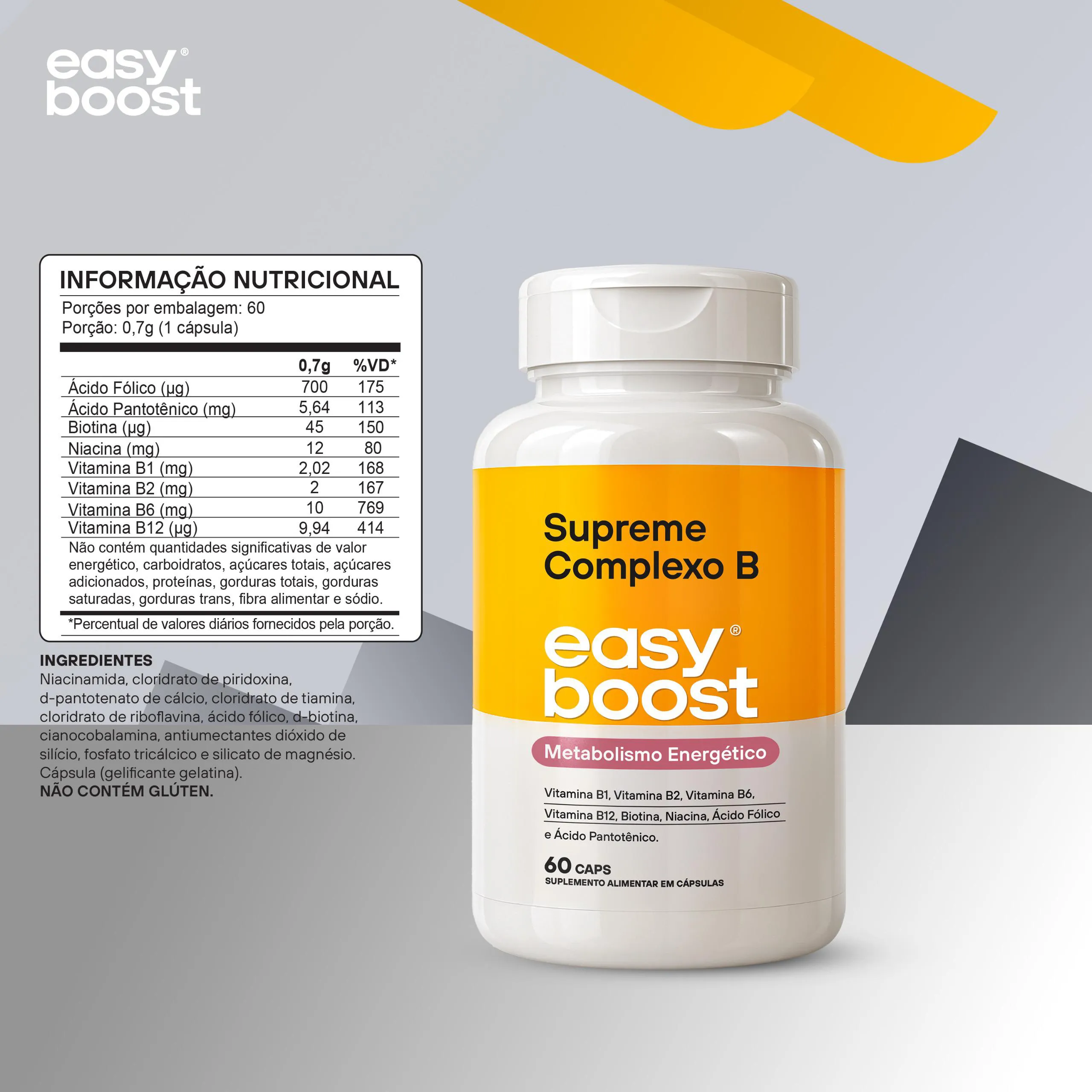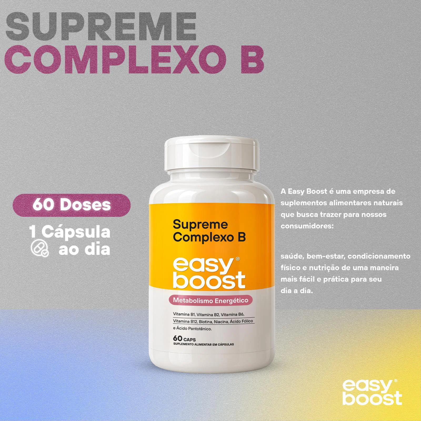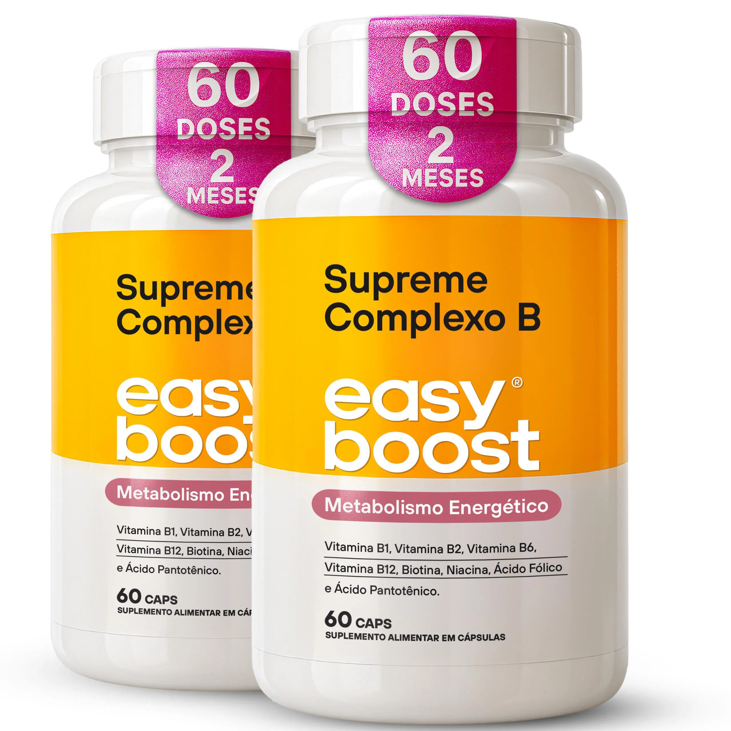 Neste anúncio você irá adquirir 2 potes de Supreme Complexo B Easy Boost com 60 cápsulas em cada, total 120 caps, com uma validade longa, de no minímo 12 meses.