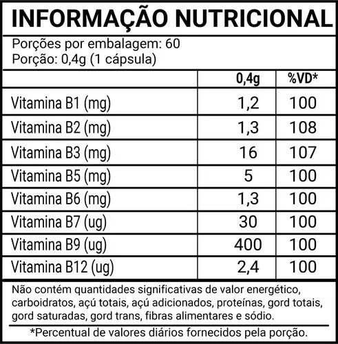 - Ingredientes Ativos: Premix de vitaminas (Mononitrato de Tiamina - Vitamina B1, Riboflavina - Vitamina B2, Nicotinamida - Vitamina B3, D-Pantotenato de Cálcio - Vitamina B5, Cloridrato de Piridoxina - Vitamina B6, D-Biotina - Vitamina B7, Ácido Fólico - Vitamina B9, Cianocobalamina - Vitamina B12) e Maltodextrina; Excipientes: Amido; Composição da Cápsula: Gelatina e água.