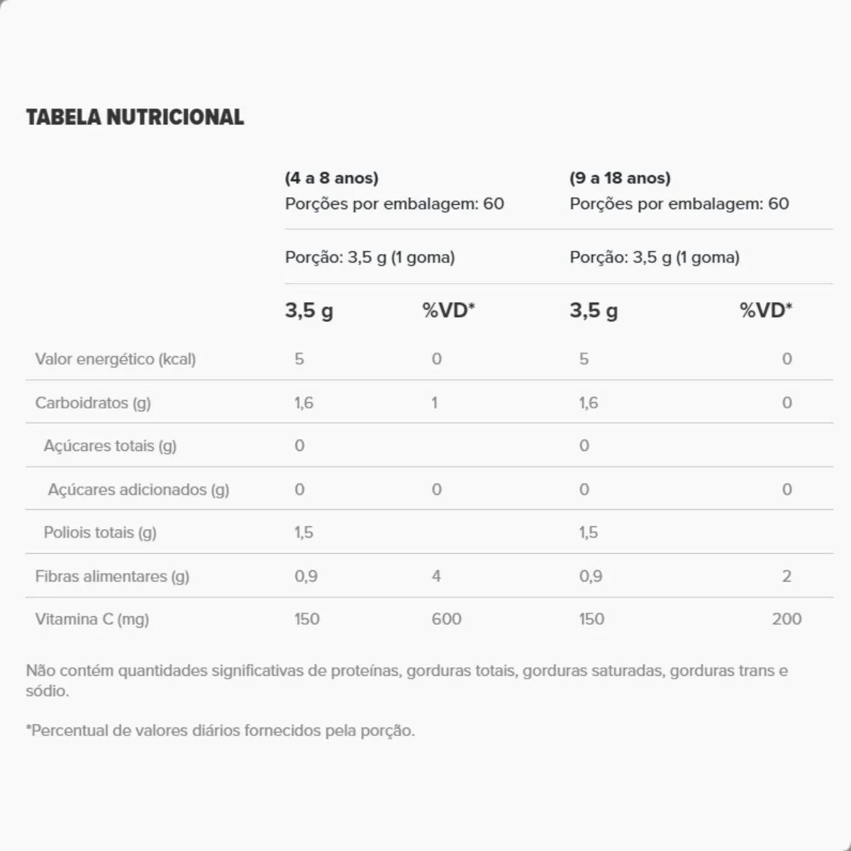 - Gomas mastigáveis com sabor agradável de frutas, facilitando o consumo.
