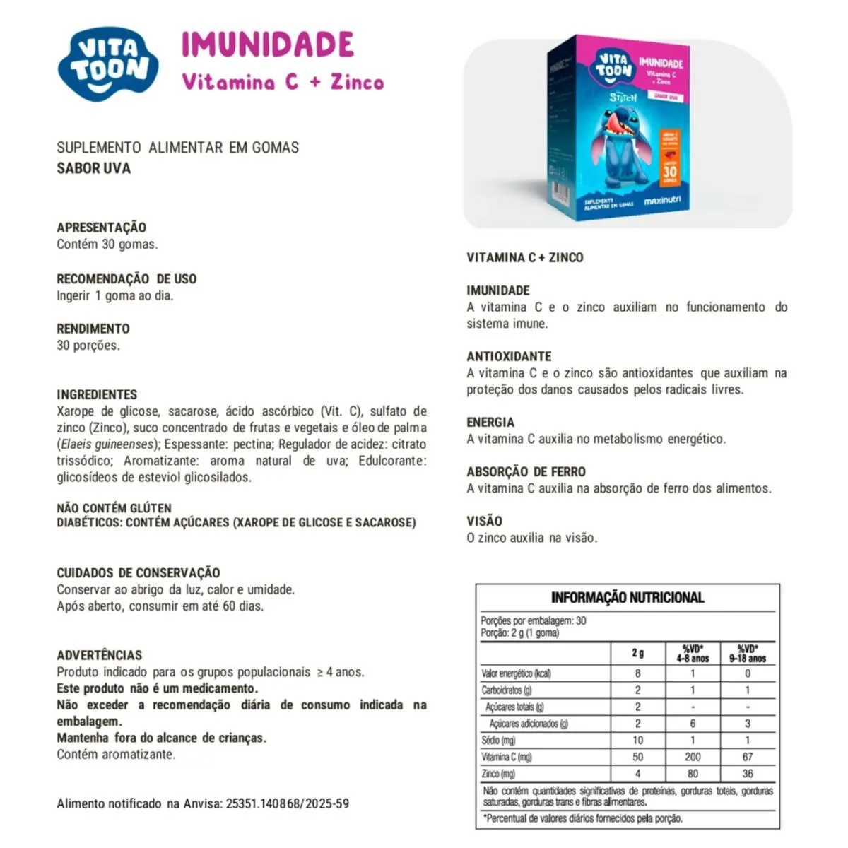 Vitatoon Maxinutri Stitch Imunidade – 30 Gomas Sabor Uva