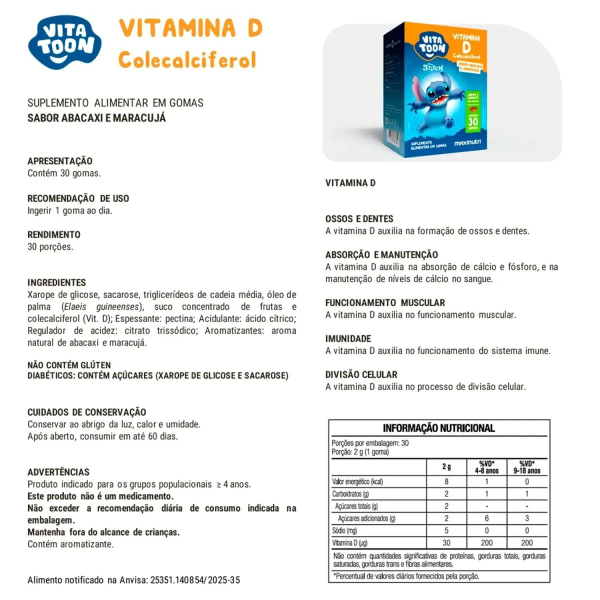Vitatoon Maxinutri Stitch Vitamina D C30 Abacaxi + Maracujá