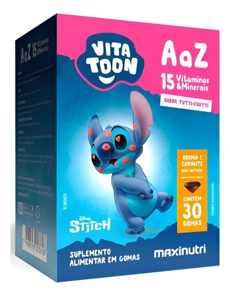Apresentamos a Vita Toon A-Z (Stitch), o suplemento alimentar em gomas que transforma a hora da vitamina em diversão! Especialmente desenvolvida para crianças a partir de 4 anos, esta goma mastigável oferece uma combinação completa de 15 Vitaminas e minerais essenciais. Com o personagem favorito da Disney, o Stitch, seu filho vai amar cuidar da saúde. A fórmula possui aromas e corantes 100% naturais. Benefícios: * ENERGIA: Vitaminas C, B12, tiamina, riboflavina, niacina, biotina e ácido pantotênico auxiliam no metabolismo energético. * VISÃO: A vitamina a, a riboflavina e o zinco auxiliam na visão. * OSSOS E DENTES: A vitamina d auxilia na formação e manutenção dos ossos e dentes, juntamente com a vitamina K e o zinco. * FUNCIONAMENTO MUSCULAR: A vitamina D auxilia no funcionamento muscular. * IMUNIDADE: As vitaminas A, D, C, B6 e B12, o ácido fólico, o selênio e o zinco auxiliam no funcionamento do sistema imune. * antioxidante: As vitaminas C e E, a riboflavina, o selênio e o zinco são antioxidantes que auxiliam na proteção dos danos causados pelos radicais livres.