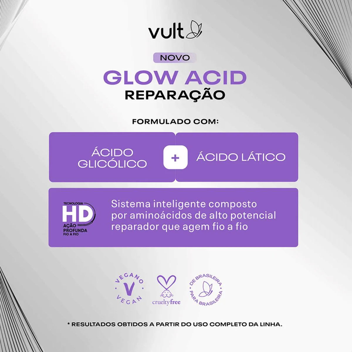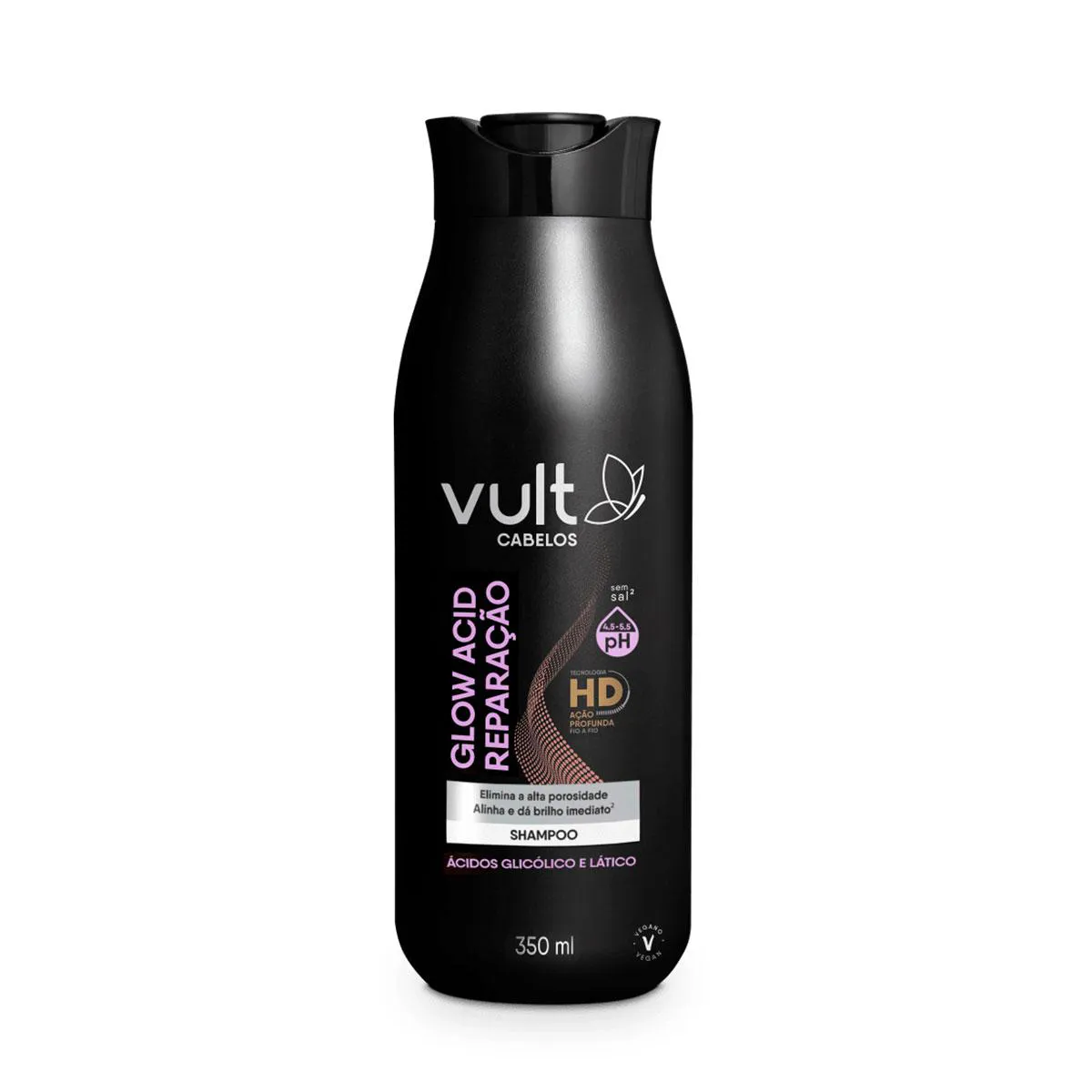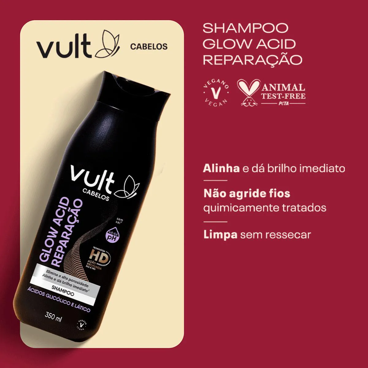 - Vult Shampoo Glow Acid Reparação limpa profundamente os cabelos e couro cabeludo.