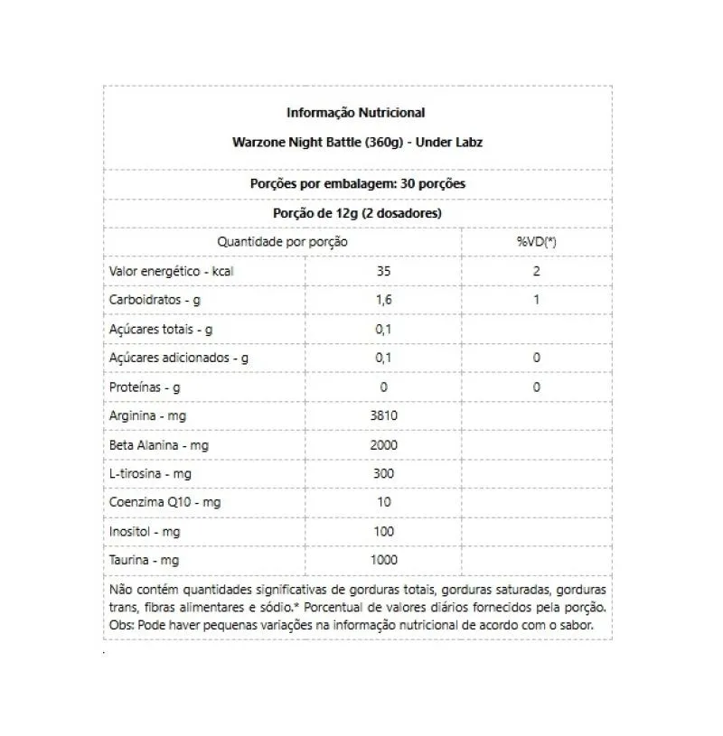 Máxima performance no treino noturno, sem atrapalhar o sono…ZERO CAFEÍNA! Totalmente livre de estimulantes, WARZONE NIGHT BATTLE garante uma explosão de energia concentrada e controlada para cumprir a missão dos treinos noturnos com efetividade, sem atrapalhar a noite de sono. BENEFÍCIOS: HIDRATAÇÃO INTRA-MUSCULAR SUPERIOR - O glicerol tem a capacidade única de atrair e reter água nas células musculares, resultando em um aumento significativo do volume muscular. AUMENTO EXTREMO DO PUMP MUSCULAR - Ao melhorar a hidratação e o fluxo sanguíneo para os músculos, o glicerol proporciona um pump muscular extremo. DURAÇÃO PROLONGADA DO PUMP - O efeito do glicerol além de ser intenso também é duradouro, mantendo o pump muscular por mais tempo, mesmo após o treino, com uma aparência muscular volumosa e vascularizada. MELHORA DO DESEMPENHO E RESISTÊNCIA - O glicerol ajuda a manter a hidratação e a resistência, permitindo que você treine com mais intensidade e por mais tempo. MAIOR RESPOSTA ANABÓLICA - Com o aumento do volume celular e o pump muscular intenso, o glicerol ajuda a estimular uma maior resposta anabólica.