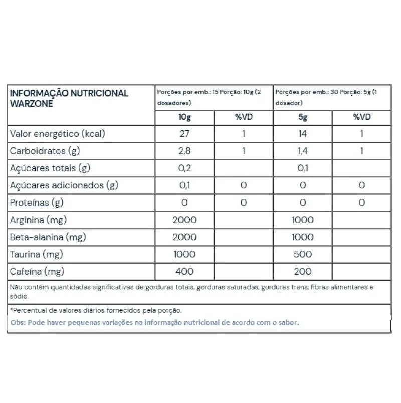 Warzone Pre Workout (300g) WARZONE COM PUMP MATRIX™ - O pré treino em 2 estágios É o primeiro e único pré treino do Brasil com PUMP MATRIX™. Um pré treino inteligente de efeito prolongado que funciona em 2 estágios. * Estágio 01No primeiro estágio ele faz você atingir o ápice de energia dos estimulantes te colocando em um nível de alto rendimento. * Estágio 02Quando isso acontece, de forma inteligente o estágio 02 é ativado com a Pump Matrix™ liberando mais potência muscular ao intensificar o fluxo sanguíneo. Ele ultrapassa os limites dos estimulantes, te colocando em um nível prolongado de ultra performance. BENEFÍCIOS: - 2.000mg de Beta Alanina, por porção;- 2.000mg Arginina;- 1.000mg Taurina;- 400mg Cafeína;- Hiper foco durante o treino;- Aumento do fluxo sanguíneo para o músculo alvo garantindo maior poder anabólico e recuperação muscular;- Aumento da resistência à dor deixando o treino mais intenso.