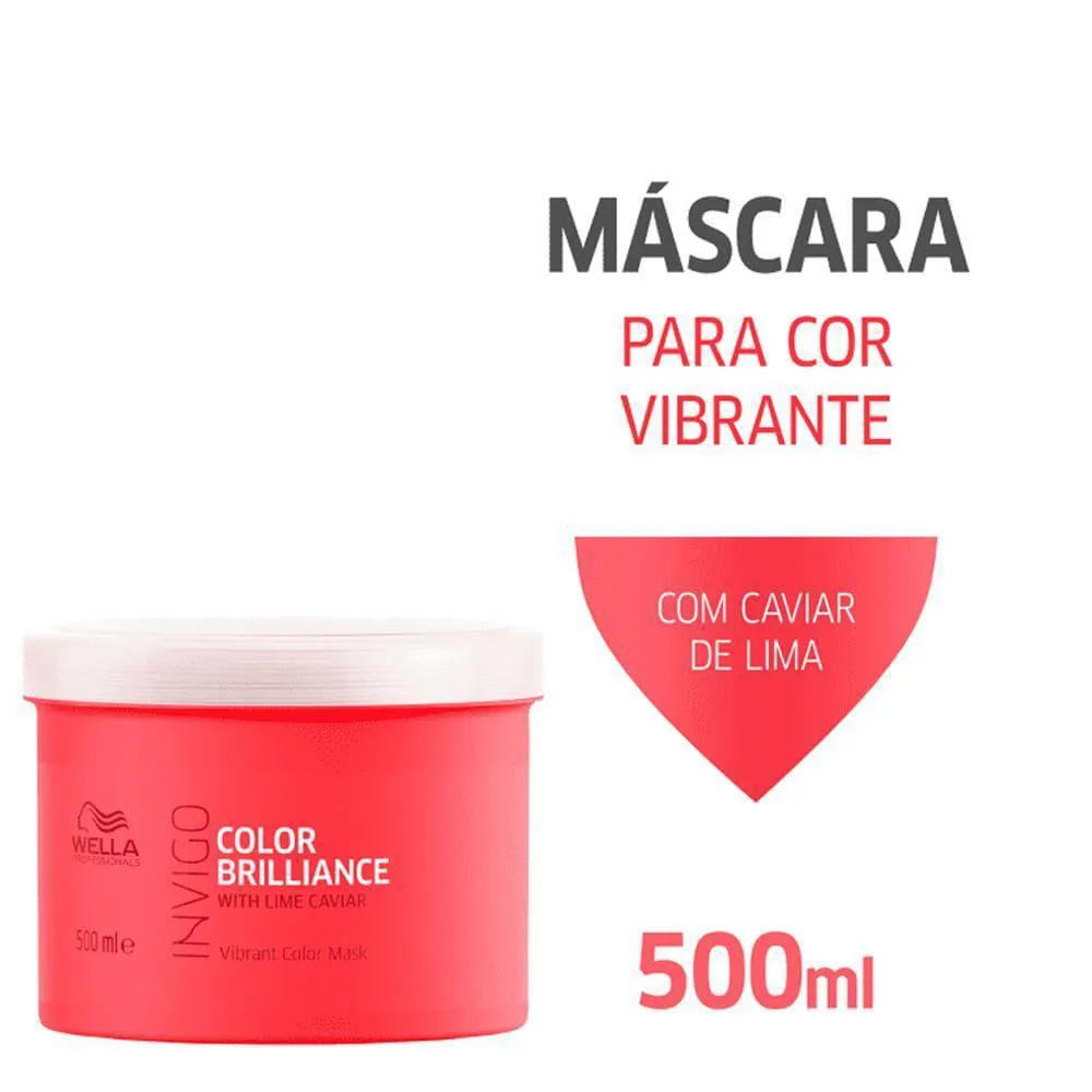 O Wella Professionals Invigo Brilliance Vibrant Color Mask - Máscara de Tratamento 500ml é ideal para quem busca proteção e brilho em cabelos coloridos. Com Color Brilliance-Blend? e óleos nutritivos, realça a cor, hidrata e suaviza, perfeito para uso semanal. O pote prático reforça a qualidade da marca.