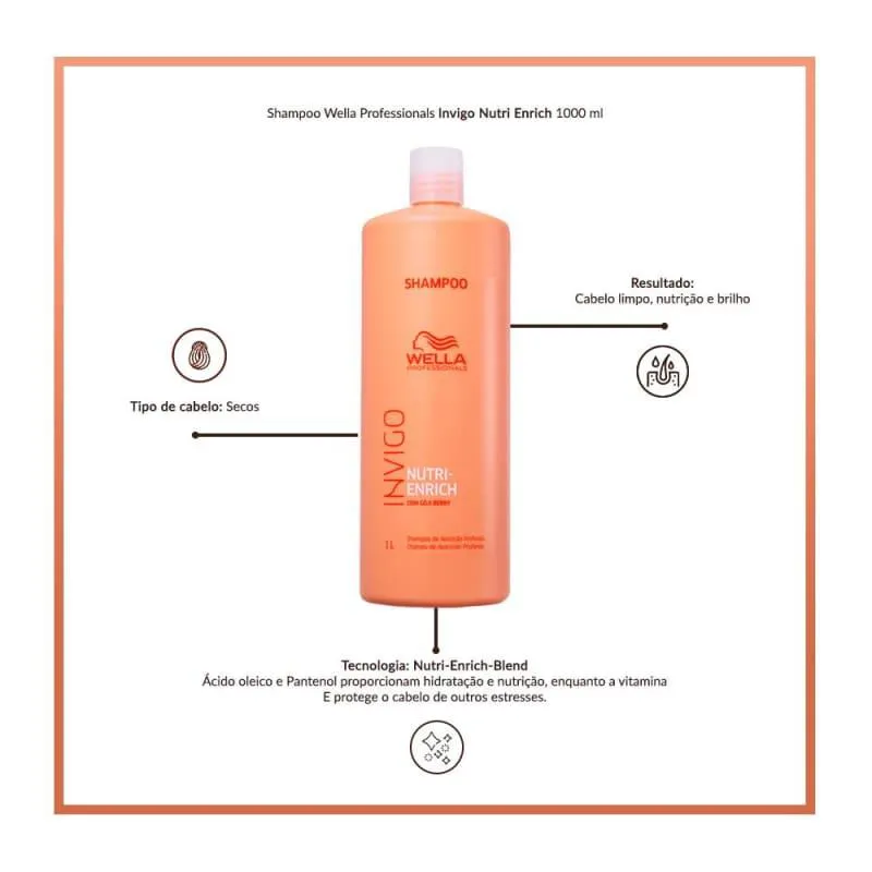 shampoo para cabelos secos, ressecados ou quimicamente tratados. Wella Professionals Invigo Nutri-Enrich promove limpeza com nutrição instantânea. O Shampoo Wella Invigo Nutri-Enrich apresenta fórmula rica em ingredientes que proporcionam maciez absoluta e muito brilho, uma vez que suaviza a superfície do