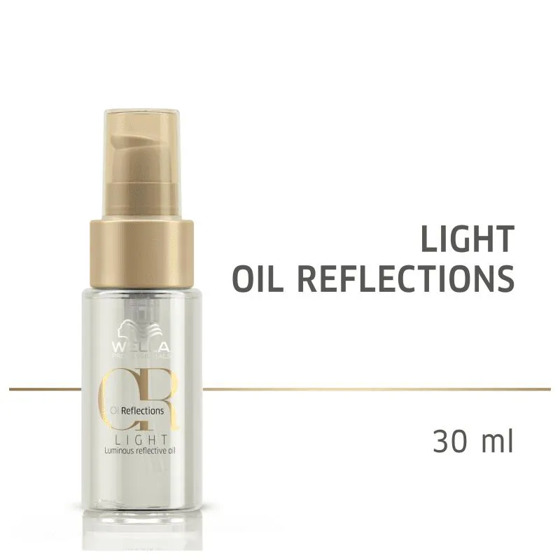 Óleo para todos os tipos de cabelos, especialmente finos. Wella Professionals Oil Reflections Light nutre instantemente os fios, sem pesar, com efeito luminoso.   A tecnologia na fórmula de Wella Professionals Oil Reflections Light foi desenvolvida para dar uma sensação de fios mais densos e com brilho saudável. Versátil e sublime, pode ser usado antes da química para proteger dos danos, como pré-shampoo e tratamento noturno.