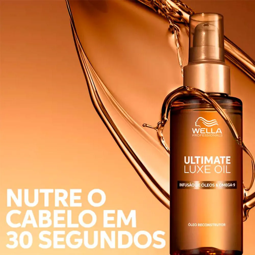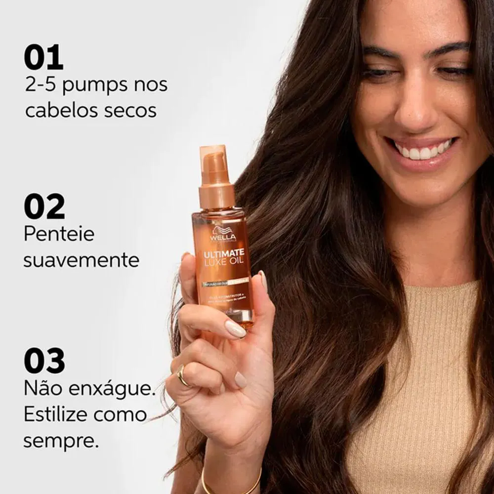 O Wella Professionals Ultimate Luxe Oil é um óleo reconstrutor de luxo desenvolvido para transformar os cabelos desde a primeira aplicação. Enriquecido com uma combinação exclusiva de óleos preciosos ? como óleo de argan, óleo de jojoba e óleo de amêndoas ?, ele penetra profundamente na fibra capilar, restaurando a hidratação, proporcionando nutrição intensa e fortalecendo os fios sem pesar. Além de deixar os cabelos incrivelmente macios, esse óleo cria uma camada protetora que sela a umidade e realça o brilho natural dos fios, oferecendo um toque sedoso e luxuoso.