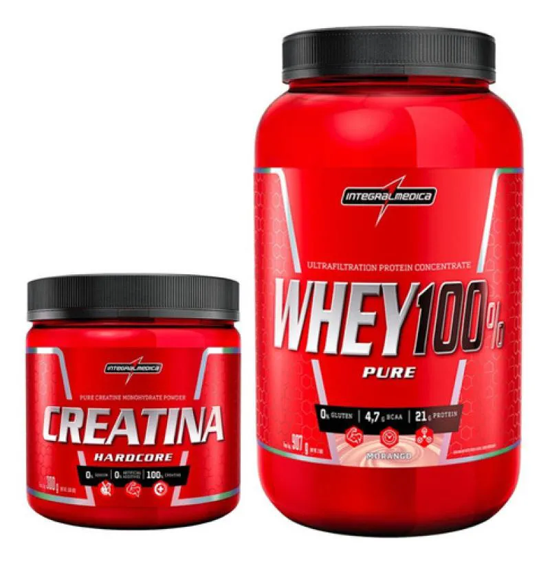 WHEY 100% PURE 907G POTE CREATINA 300G INTEGRAL MéDICA SABOR MORANGO