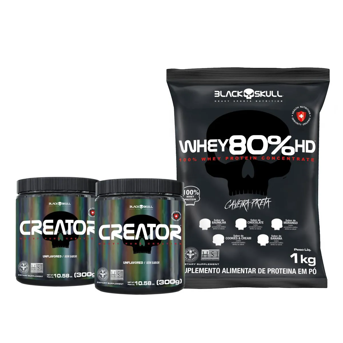 O kit é um conjunto de suplementos esportivos composto por Whey Protein 80% e Creatina Creator Caveira Preta, desenvolvido para potencializar o desempenho físico e os resultados de treino. O Whey Protein 80% possui alta concentração proteica com aminoácidos essenciais, enquanto a Creatina Creator é um suplemento com creatina hidrolisada.