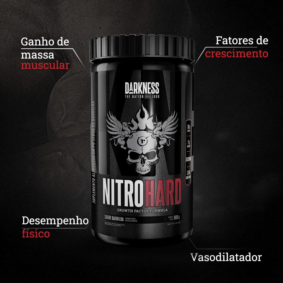 Nitrohard é um tradicional suplemento proteico que traz toda a força da linha Darkness em sua formulação. Por ser uma proteína que combina duas fontes proteicas de alto valor biológico, WPI (whey protein isolado) e WPC (whey protein concentrado), ofertando 31 g de proteína e 6,9 g de BCAA na porção.
