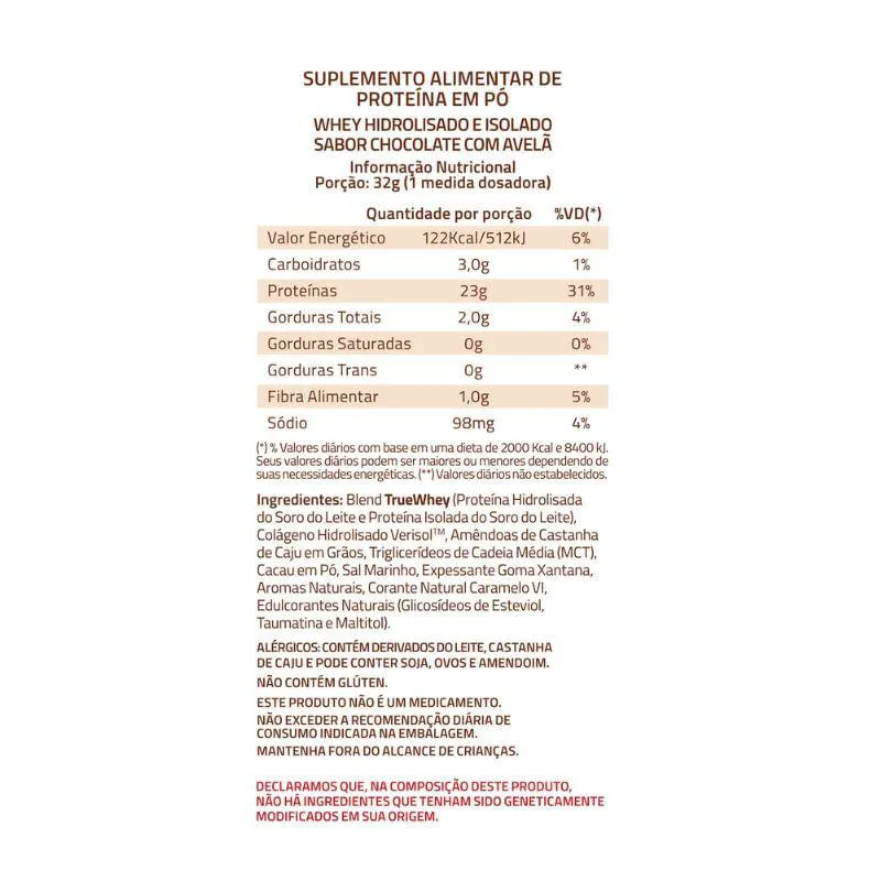 Proteína isolado do soro do leite: passa por um processo minucioso de filtragem, eliminando a lactose e a caseína. Proteína hidrolisado do soro do leite: além de ter um processo minucioso de filtragem, essa proteína passa por um processo chamado hidrólise, onde as moléculas de proteínas são quebradas em segmentos ainda menores, chamados peptídeos, o que torna a digestão e absorção mais fácil pelo organismo.Sugestão de consumo:
