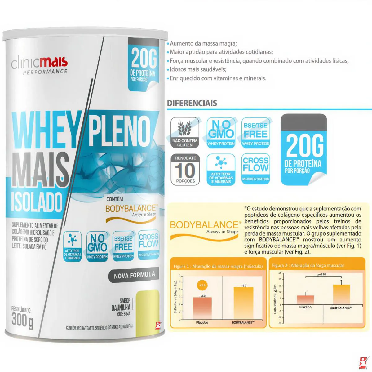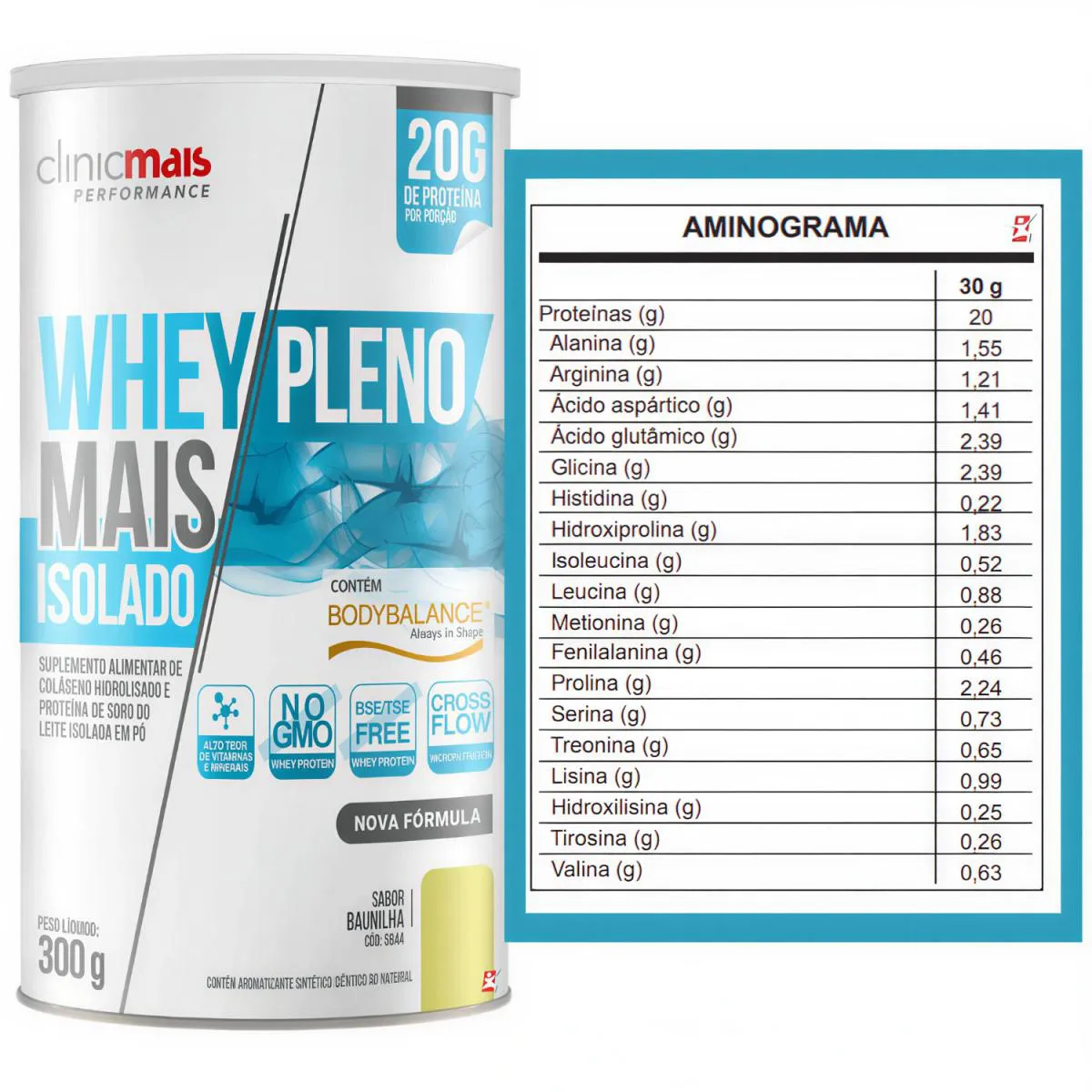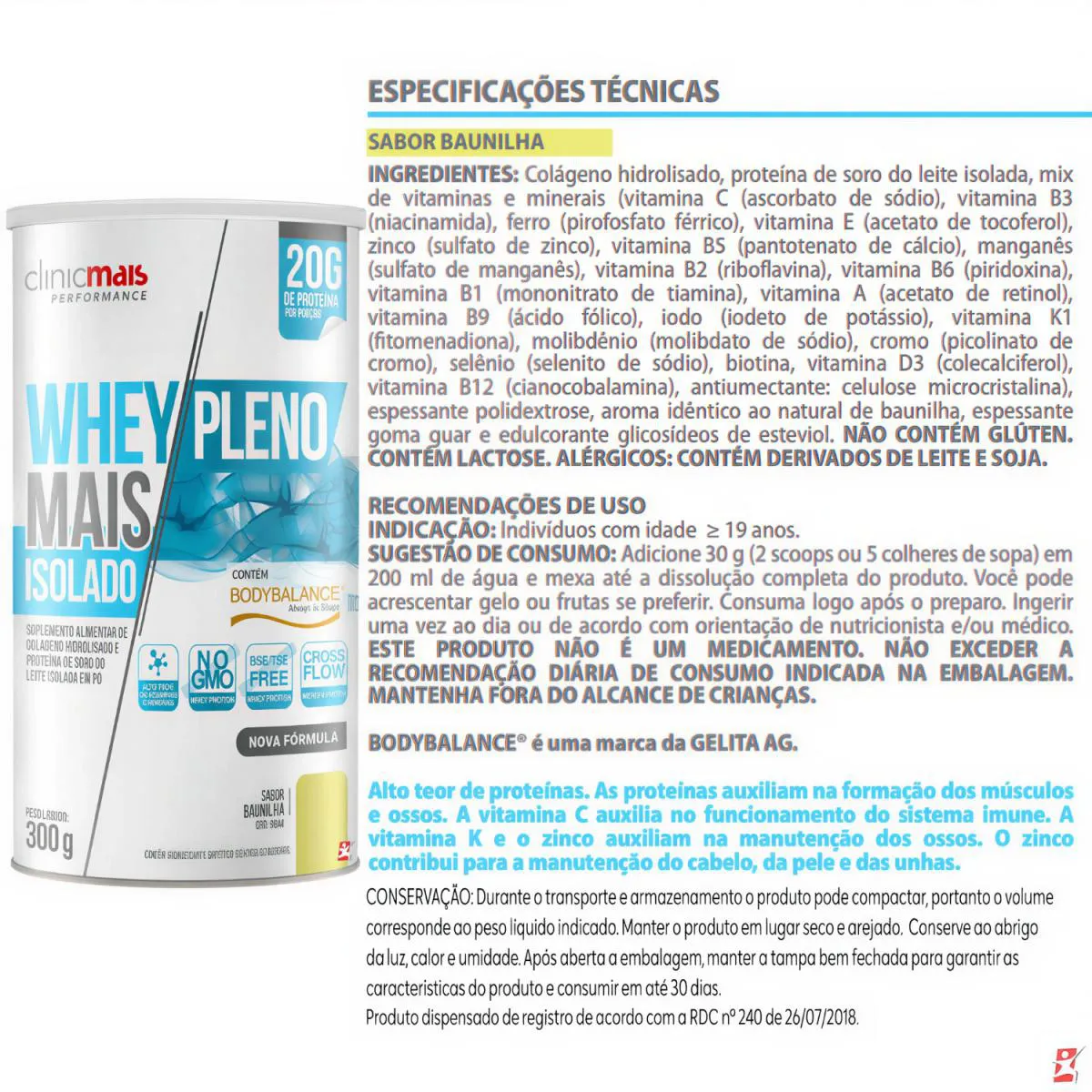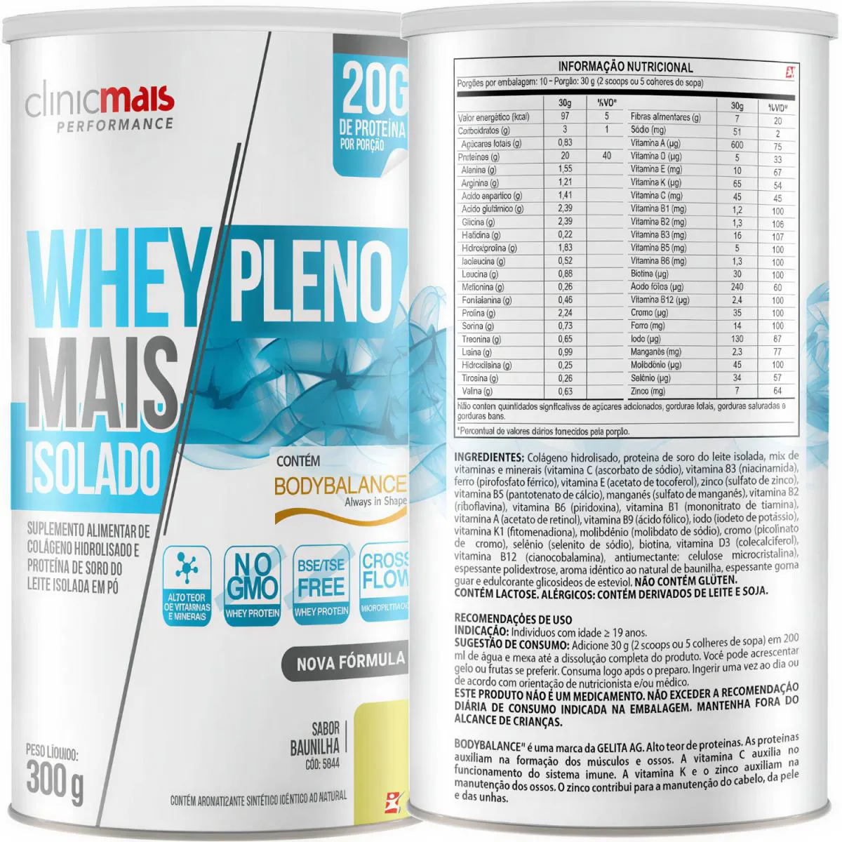 WHEY ISOLADO MAIS PLENO + AMINOÁCIDOS + VITAMINAS + minerais 300G BAUNILHA - CLINICMAIS DESCRIÇÃO Whey Mais Pleno Isolado com BodyBalance® combina proteína isolada e BodyBalance®, um colágeno bioativo exclusivo da GELITA AG. Estudos comprovam que sua suplementação, aliada a treinos de resistência, auxilia no aumento da massa magra, redução da gordura corporal e fortalecimento muscular. Rico em vitaminas e minerais essenciais, também contribui para a saúde da pele, articulações e ossos, tornando-se um suplemento completo para desempenho e bem-estar. Contém lactose. Não contém glúten. BENEFÍCIOS - Cada frasco rende 10 doses/porções; - 2 Scoops ou 5 colheres de sopa por dose/porção; - Ajuda no ganho e manutenção de massa muscular; - Melhora a recuperação após os treinos; - Auxilia na redução de gordura corporal; - Aumenta força e desempenho muscular; - Contribui para saúde das articulações e ossos; - Ajuda na firmeza da pele, cabelo e unhas; - Fortalece o sistema imunológico. RECOMENDAÇÕES DE USO - Quantidade diária: Diluir 30g (2 scoops ou 5 colheres de sopa) em 200ml de água, mexendo até completa dissolução. - Horário ideal: Pode ser consumido no pós-treino, para recuperação muscular, ou em outros momentos do dia, conforme a necessidade proteica. DEMAIS INFORMAÇÕES - Combine com uma alimentação rica em proteínas e antioxidantes para fortalecer pele, músculos e articulações. - Utilize o whey em receitas como shakes, smoothies e panquecas proteicas para diversificar a ingestão. - Associe o consumo a um plano de exercícios físicos para potencializar a síntese proteica e o ganho muscular. TABELA NUTRICIONAL - COMPOSIÇÃO - RECOMENDAÇÕES & CUIDADOS Anexo nas imagens do anúncio.