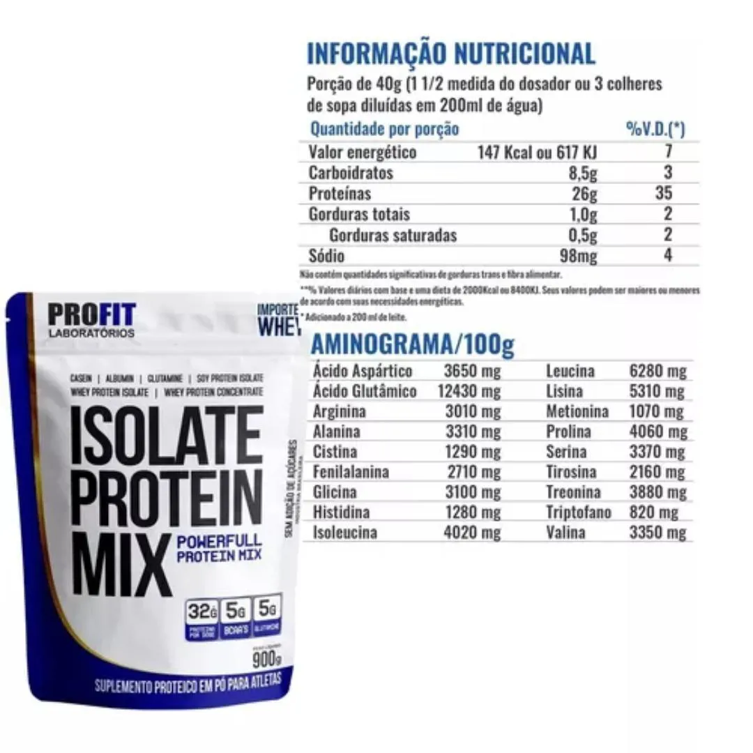 ISOLATE PROTEIN MIX - PROFIT LABS: É um blend de proteínas desenvolvido com as mais nobres proteínas disponíveis: Proteína Isolada do Soro do Leite, Proteína Hidrolisada do Trigo (Glutamina Peptídeo), Caseína, Proteína Isolada da soja e Albumina, que possuem diferentes tempos de absorção pelo organismo, que garantem uma ingestão mais adequada de proteínas, auxiliando na construção de um corpo mais forte e definido.
