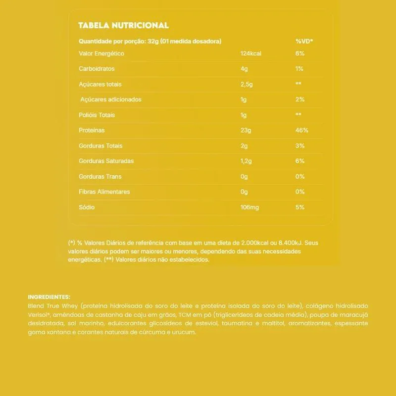 O Whey Protein da marca True Source é elaborado com um blend de proteína isolada e hidrolisada do soro do leite, é livre de glúten, açúcar e corantes artificiais. Pode ser usado como pré ou pós-treino, e possui sabor irresistível de mousse de maracujá.
