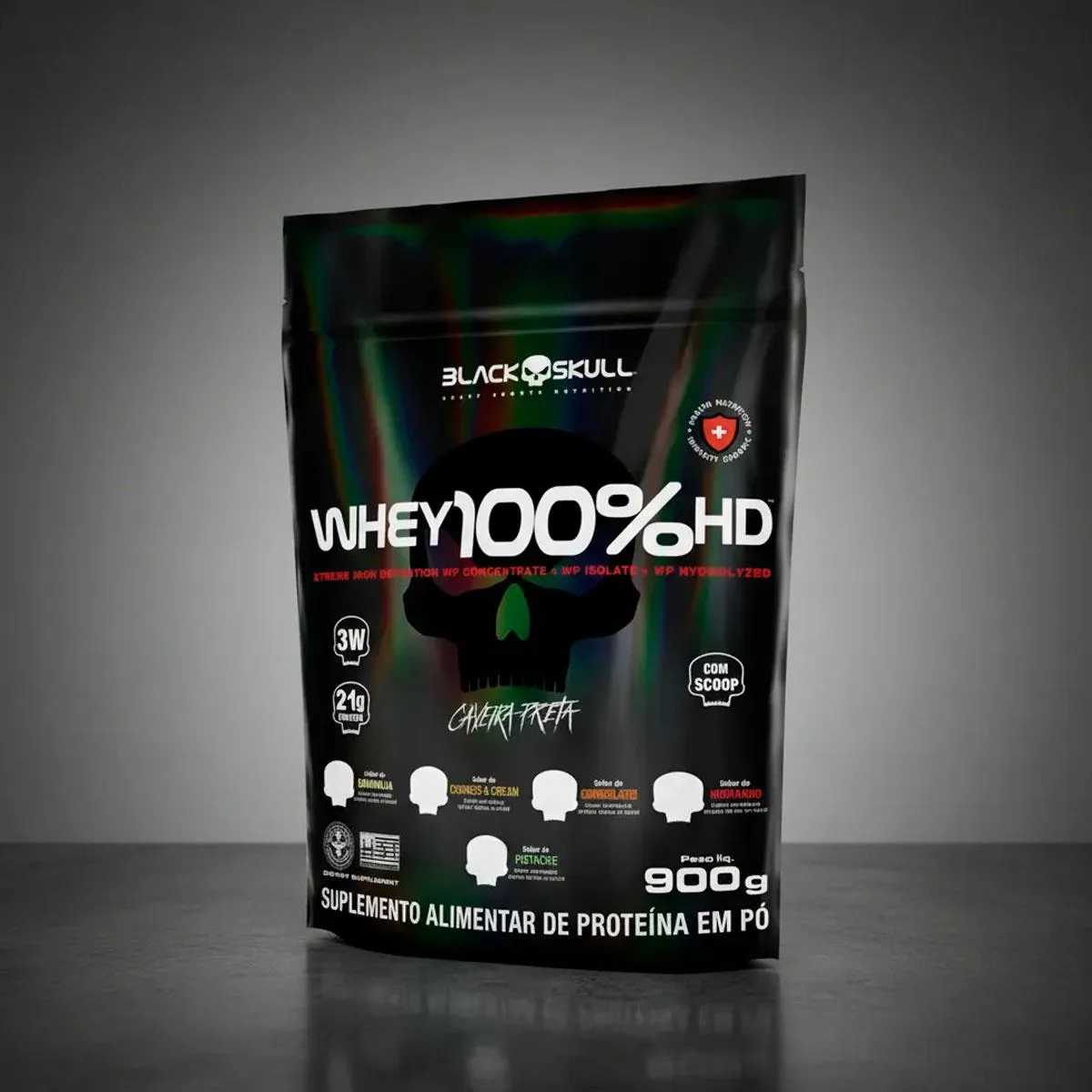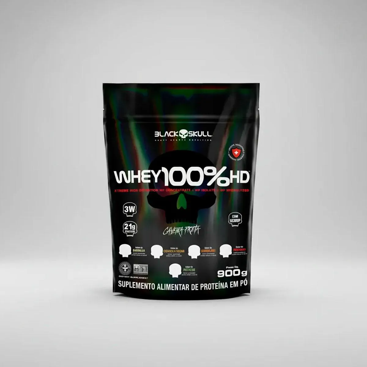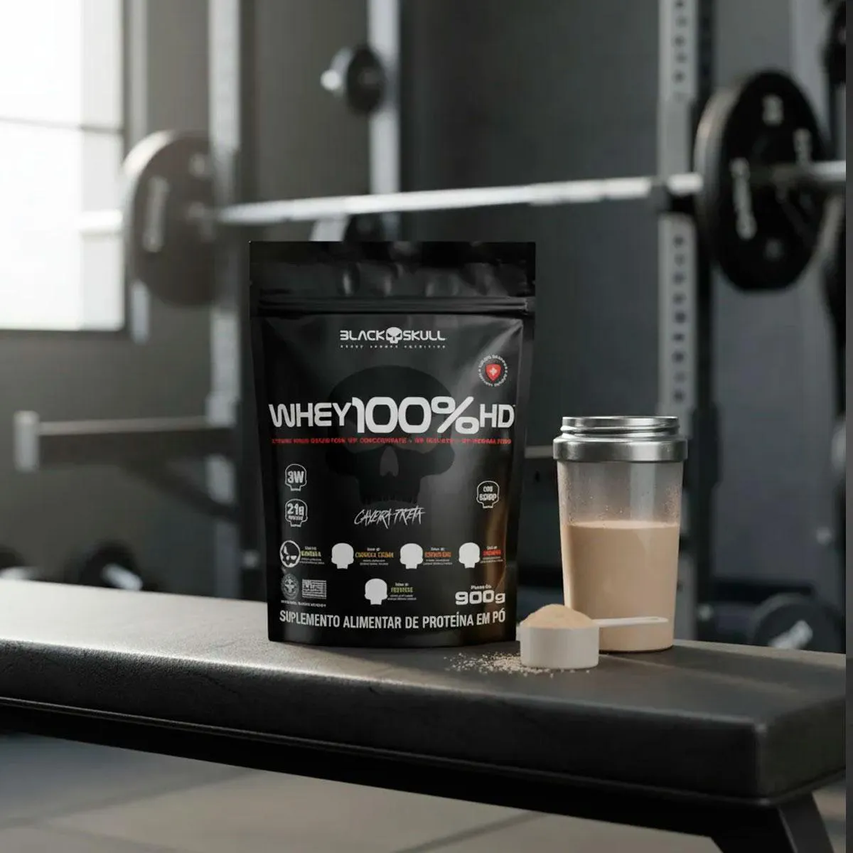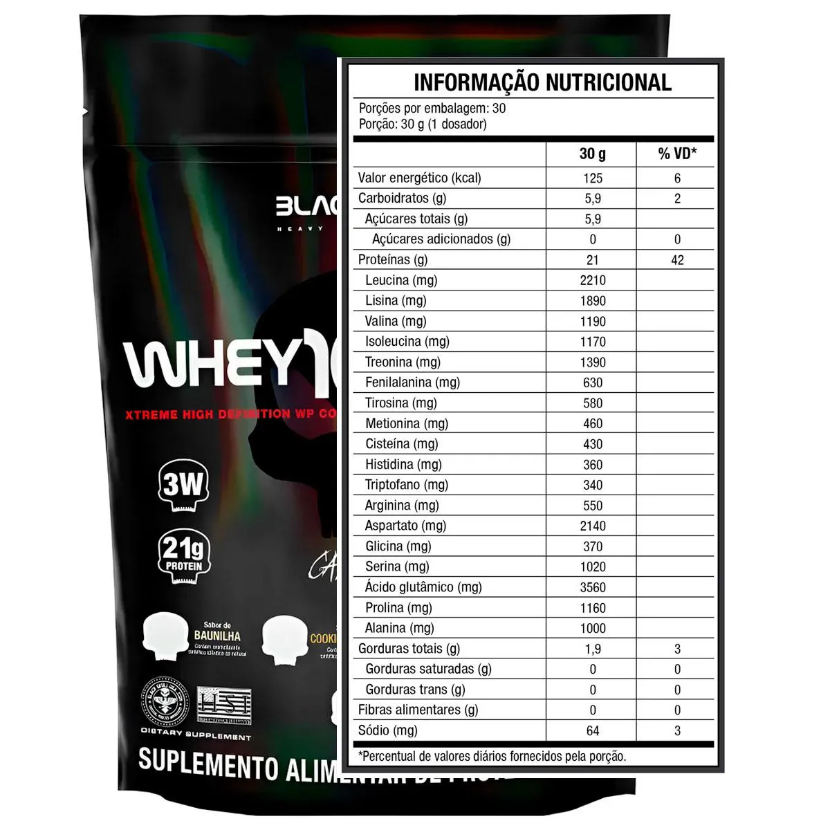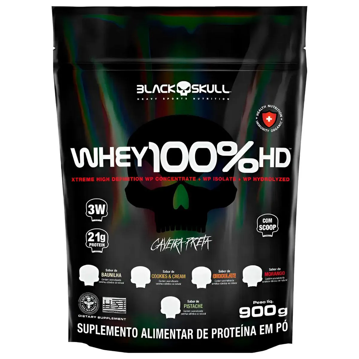O WHEY 100% HD BLACKSKULL USA é mais um mega suplemento da linha Caveira Preta Series. Composto por três tipos de Whey Protein (concentrado, isolado e hidrolisado). Sua composição conta também com a adição de BCAA (leucina, isoleucina, valina) que são, aminoácidos de cadeia ramificada. O Whey Protein é uma proteína do soro do leite, sendo um dos suplementos mais consumidos do mundo atualmente por diversas áreas esportivas e clínicas; garante proteínas de alto valor biológico auxiliando no desenvolvimento e recuperação das fibras musculares tanto em atletas quanto em de praticantes de atividades físicas em geral, até mesmo em pacientes que necessitam de uma dieta enteral. MODO DE CONSUMO: Misture 3 colheres de sopa (aprox. 30g) de Whey 100% HD em 150 ml de água, ou de acordo com a consistência desejada, e consuma uma vez ao dia ou de acordo com a orientação de um profissional especializado. CONTÉM LACTOSE. NÃO CONTÉM GLÚTEN. *Esse produto não é um medicamento, não tem como objetivo auxiliar no tratamento, cura ou combate de qualquer doença Registro no M.S. nº Produto dispensado de registro RDC 240 de 2018