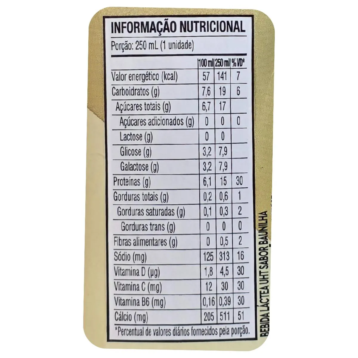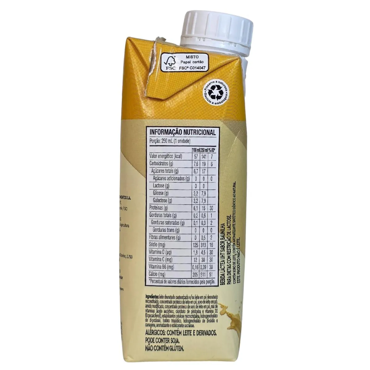 Ingredientes: leite desnatado pasteurizado e/ou leite em pó desnatado reconstituído, concetrado proteíco de leite em pó, soro de leite em pó, amido modificado, concetreado proteíco de soro de leite em pó, mix de vitaminas (ácido ascórbico, cloridrato de piridoxina e vitamina D2 (ergocalciferol)), estabilizantes celulose microcristalina, hidrogenofosfato de di-potássio, fosfato trissódico, hidrogenofosfato de di-sódio e carragena, aromatizante e edulcorante sucralose. ALERGICOS: Contém leite e derivados, pode conter soja. Não contém glúten.