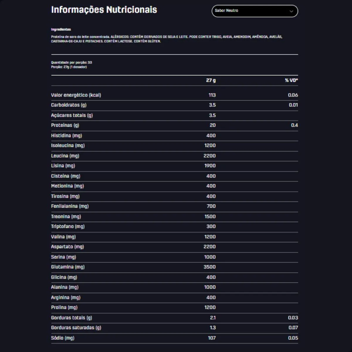 O Whey Protein Concentrado 900 g da Dux contém proteína do soro do leite em sua forma mais próxima do natural, preservando peptídeos bioativos. Cada dose de 30 g fornece em média 20 g de proteína com pequenas quantidades de carboidratos e gorduras, tornando‑o uma opção equilibrada para atletas e pessoas ativas.